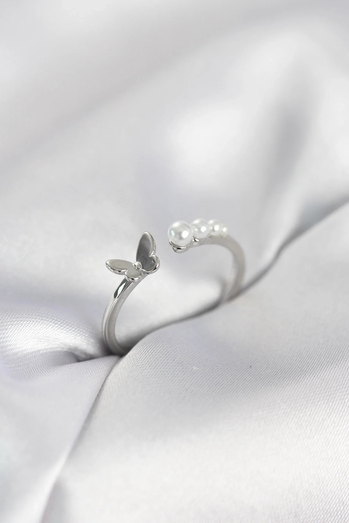 İncili Kelebek Model Gümüş Renk Pirinç Kadın Yüzük