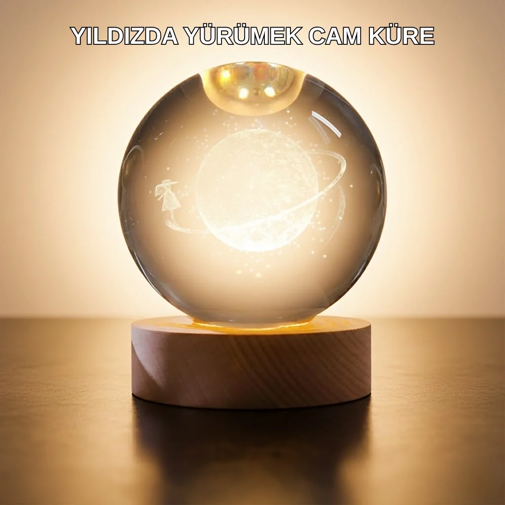 Işıklı Sarı Cam Küre ve Kız Figürü Ahşap Standlı Dekoratif Lamba