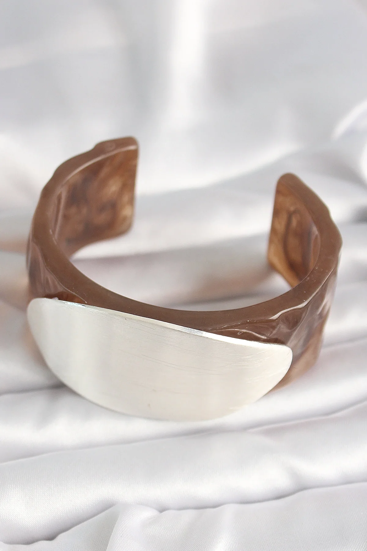 Kahverengi Mermer Desen Akrilik Plastik Gümüş Oval Plaka Model Vintage Kadın Bilezik