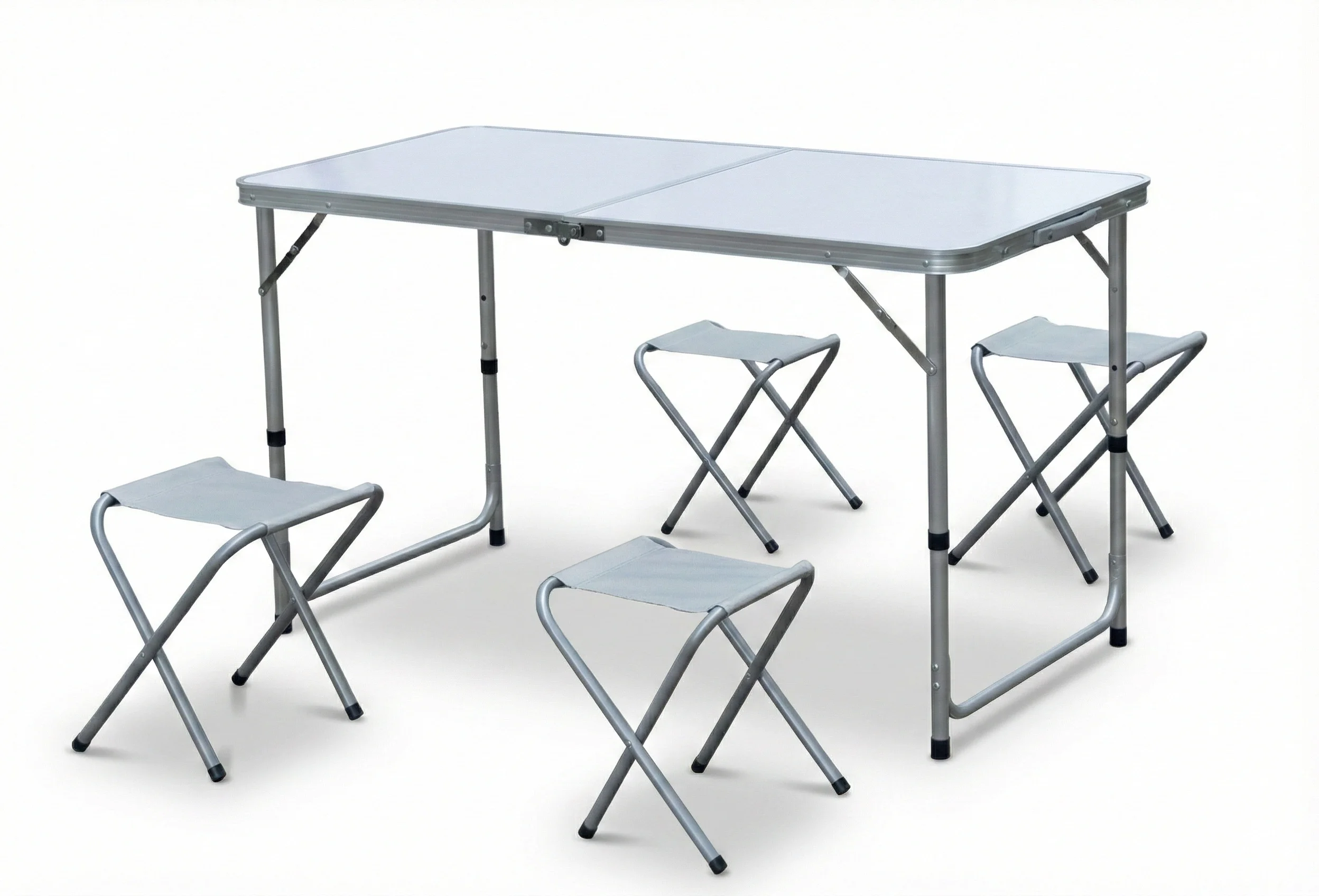 Alüminyum Katlanabilir Kamp Masa Seti + 4 Tabure katlanabilir kamp masası seti ve 4 taburesi ile kapalı ve açık birçok alanda rahatınız ve konforunuzdan ödün vermeyeceksiniz. Farklı pek çok alanda kullanıma uygun olan ergonomik kamp masası ve tabureleri plajda, bahçede, balkonda, balık avında, kamp alanlarında ya da piknik yerlerinde keyifle ve güvenle kullanabilirsiniz. Ergonomik bir tasarıma sahip olan kamp masası ve tubureler kolayca kurulup kaldırılabilir,