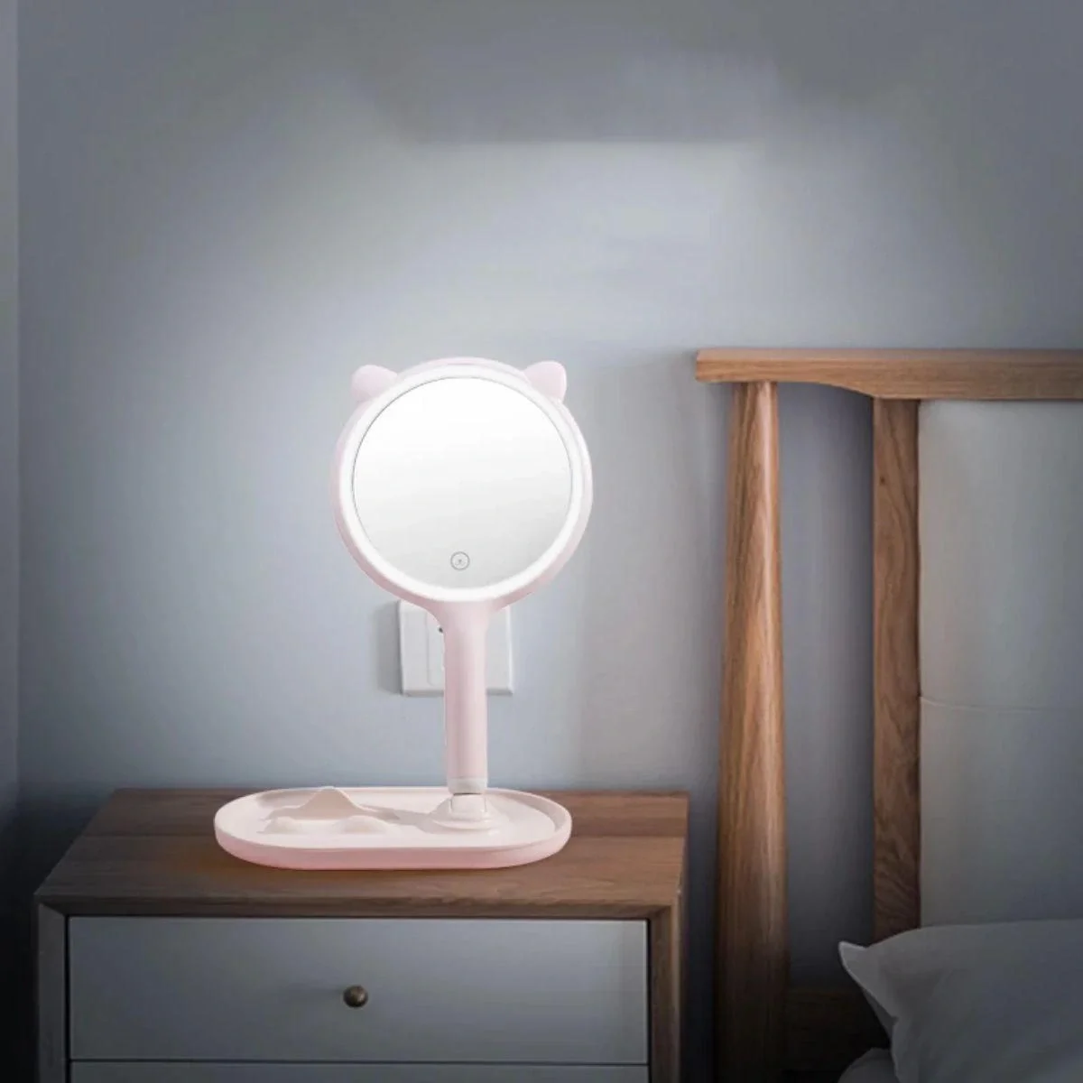 Kedi Kulaklı Telefon Standlı Yuvarlak Dokunmatik Led Ayarlı Masa Üstü Makyaj Aynası