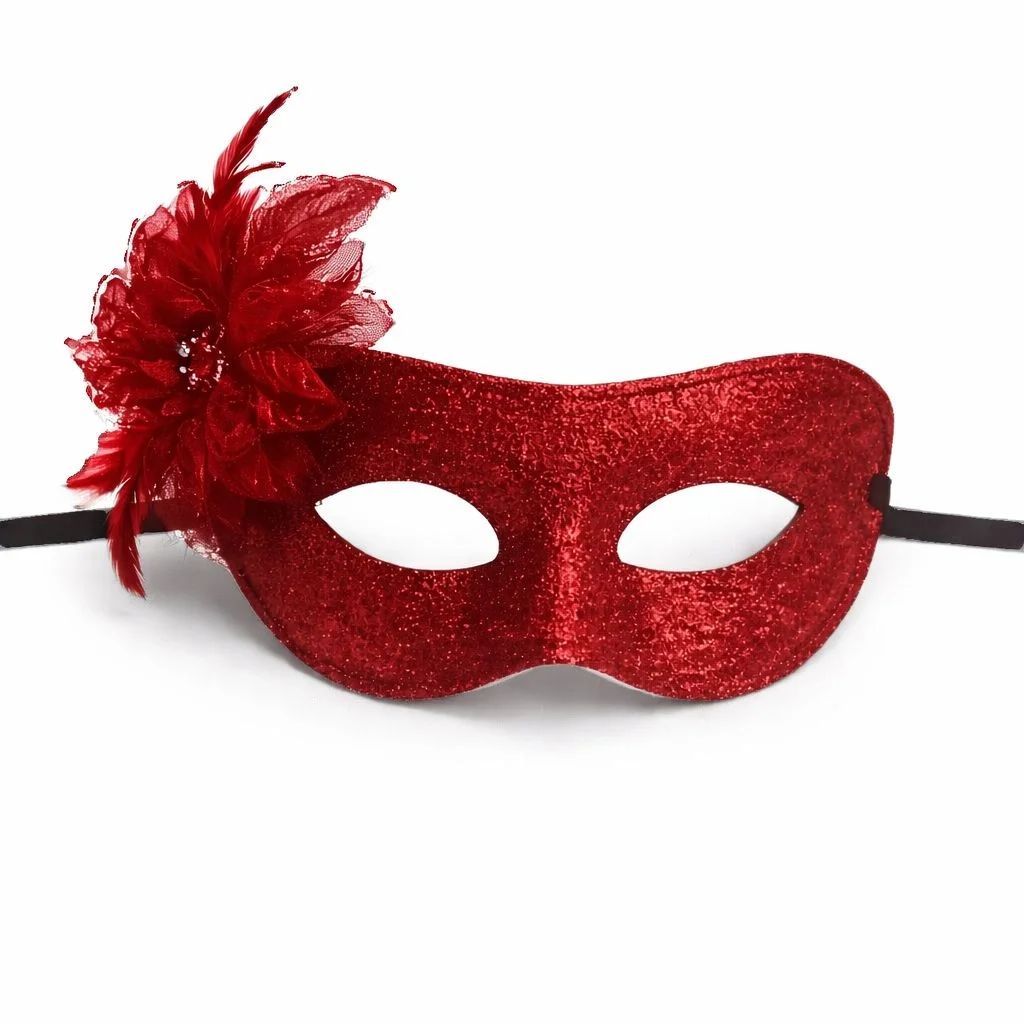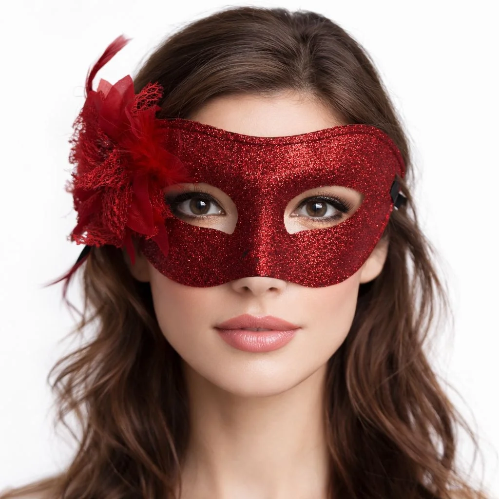 Maskeli partilerde fark yaratmak isteyenler için tasarlanan kırmızı simli tüylü kadın balo maskesi, zarif Venedik stilini modern glitter dokunuşuyla birleştirir.