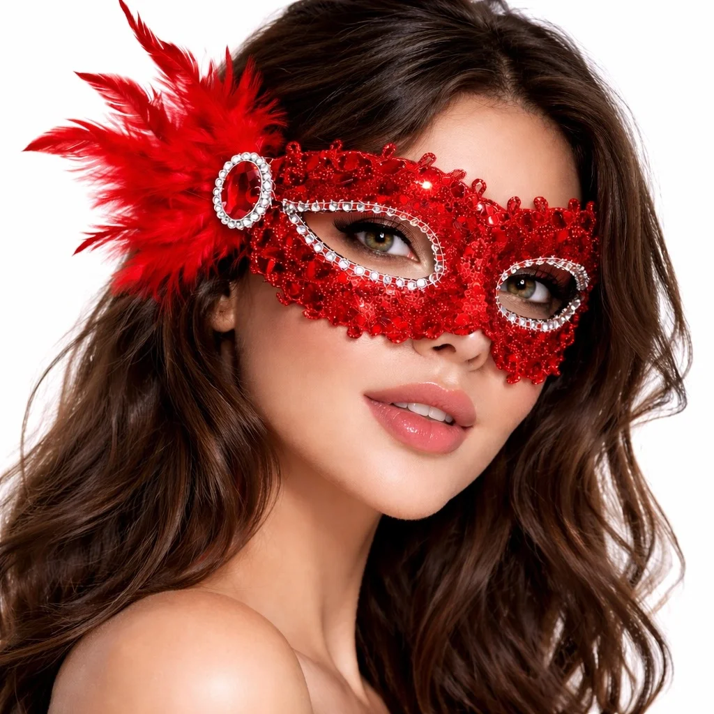Göz alıcı kırmızı rengi ve parlak payet kaplamasıyla tasarlanan Kırmızı Tüylü Venedik Maskesi, özel gecelerde tüm dikkatleri üzerinize çekmenizi sağlar.