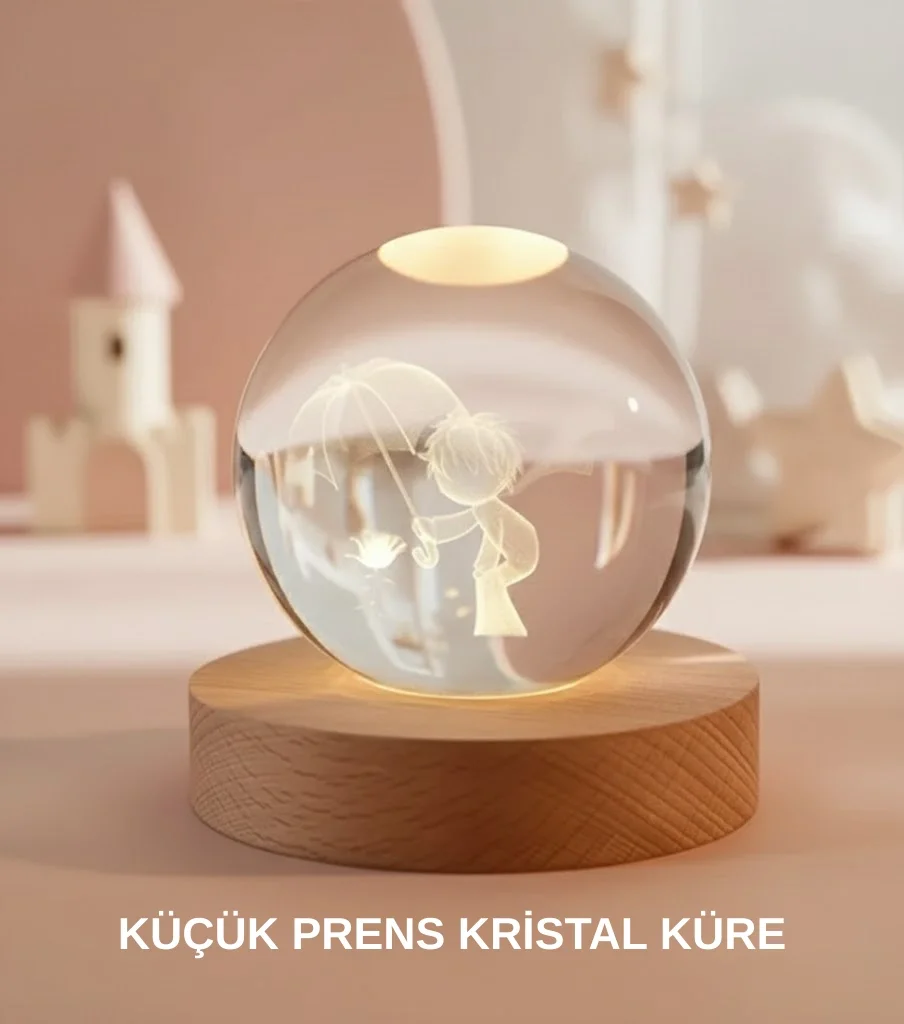 Küçük Prens Figürlü 3D Kristal Top Sıcak Işıklı USB Ahşap Tabanlı Dekor Lamba