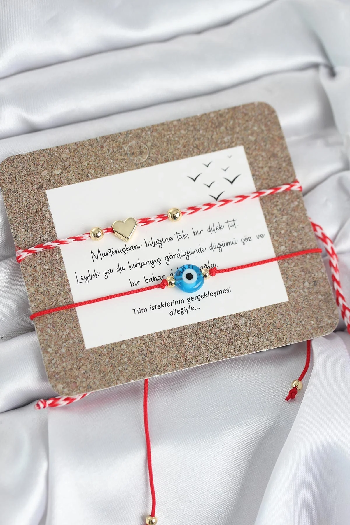 Bileklikler asansörlü makromedir. Objelerdeki renkler karışık renkte gönderilebilir.Martenicka Hikâyesi ve KökeniMartenicka geleneği, baharın gelişi, doğanın uyanışı ve iyilik–sağlık dilekleri ile ilişkilidir.En yaygın anlatıya göre:Balkan mitolojisinde “Baba Marta” (Mart Ana) adında bir figür bulunur.Baba Marta’nın yüzü neşeli olduğunda hava ısınır,Kızdığında ise yeniden soğur veya kar yağar.İnsanlar Baba Marta’nın yüzünü güldürmek, baharı çağırmak ve kötü ruhları uzak tutmak için kırmızı-beyaz ipten Martenicka takarlar.