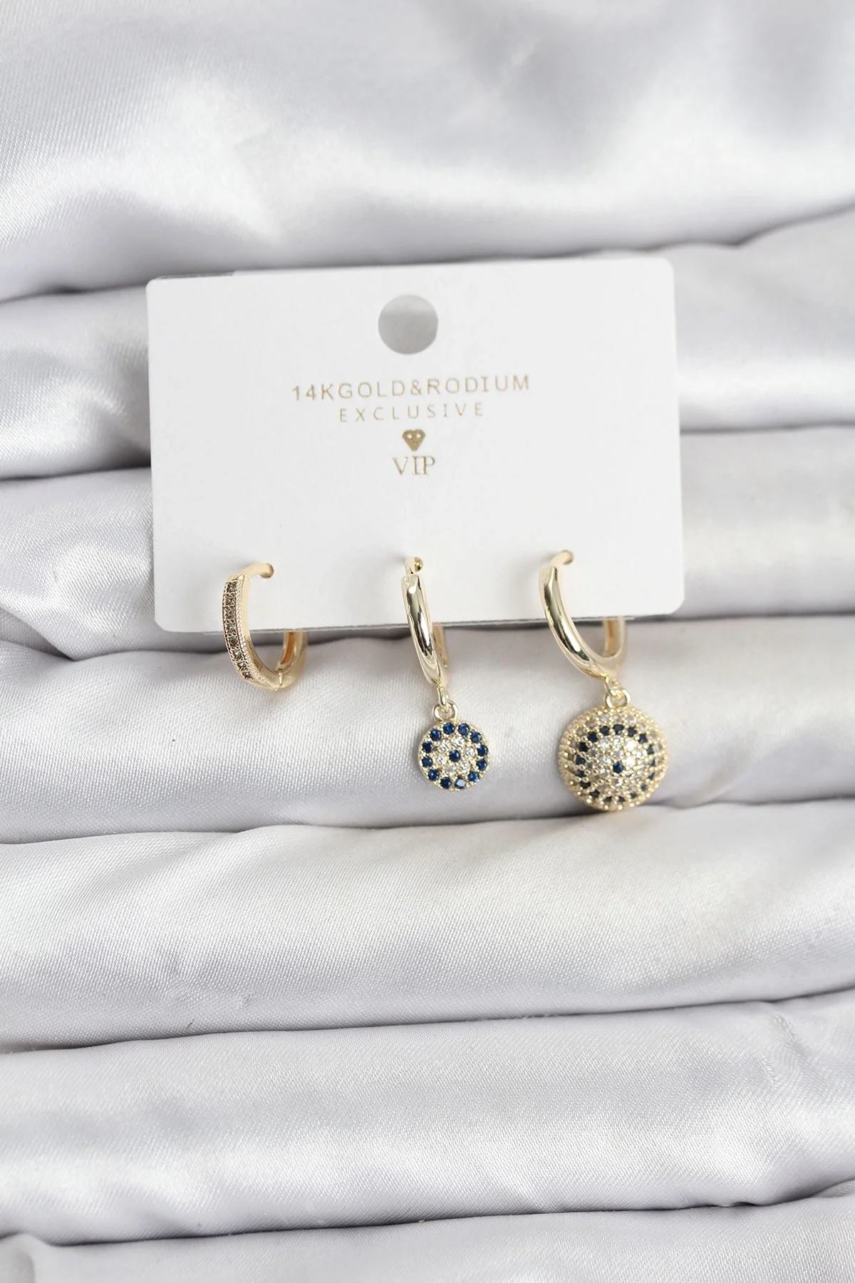 Nazar Model Gold Renk Pirinç 3'lü Kadın Küpe Seti
