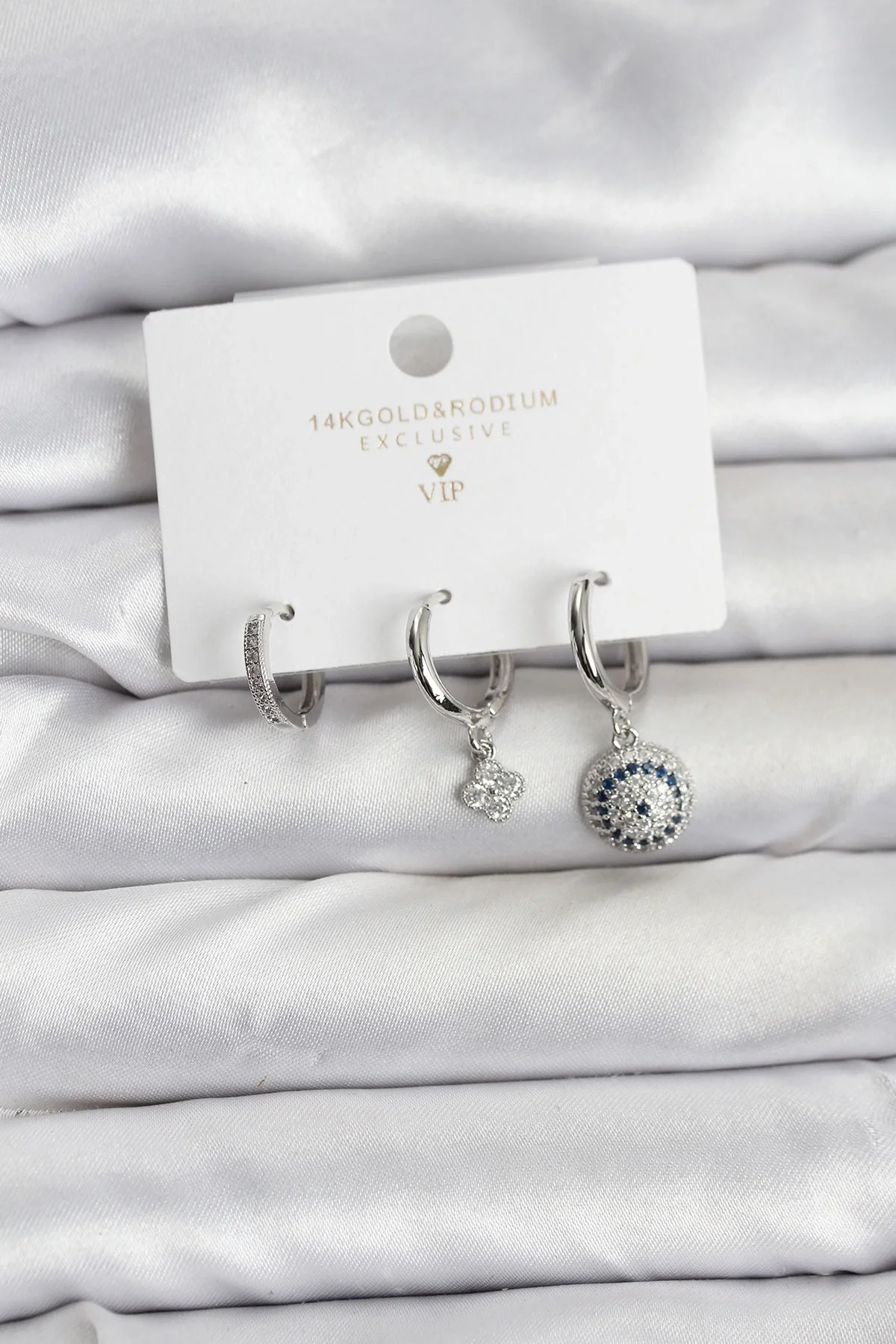 Nazar Model Gümüş Renk Pirinç 3'lü Kadın Küpe Seti