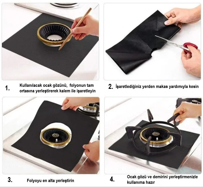 Paket içeriği: 4 adet Ocak Koruyucu Folyo Yanmaz Yapışmaz SiYAH