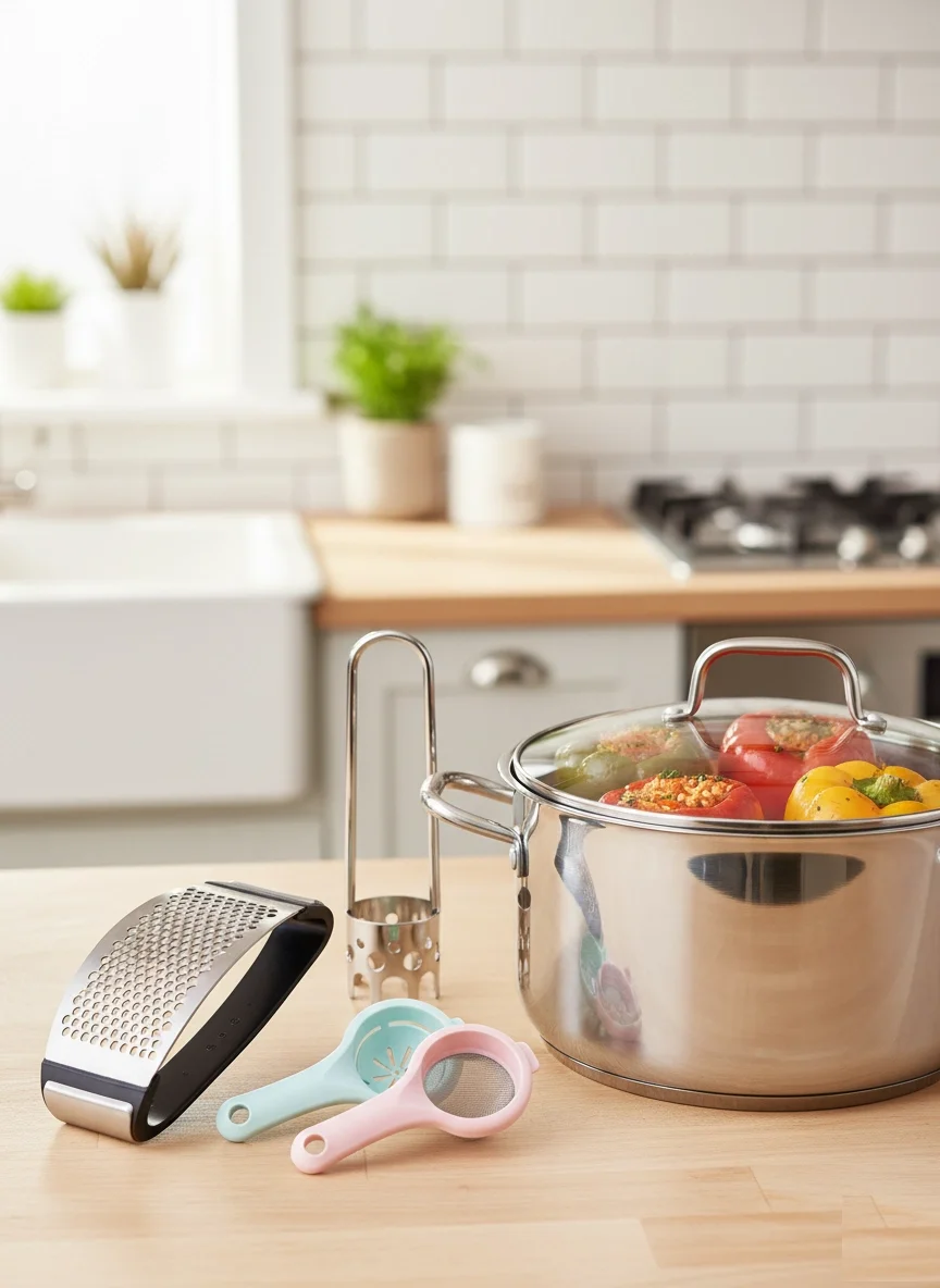 Sarımsak ezici, biber & kabak oyacağı, yumurta akı ayırıcı ve 2’li çay süzgeci ile yemek hazırlığı artık hızlı ve zahmetsiz. Dayanıklı, paslanmaz ve kolay temizlenir. Mutfakta zaman kazanın, lezzeti artırın!