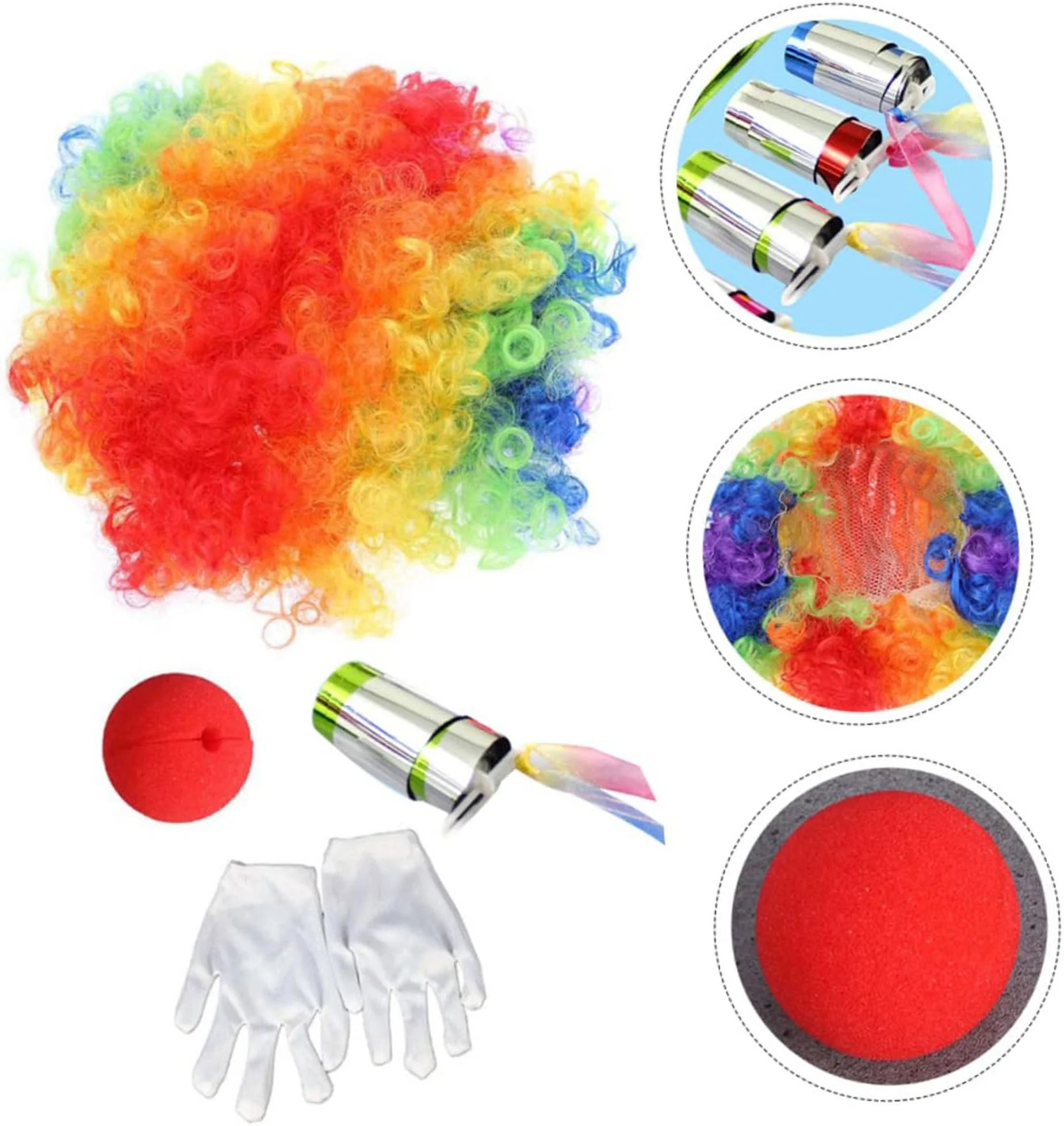 Palyaço Saç Palyaço Burun Palyaço Eldiven Palyaço Sihirli Baston 4 lü Seti, kostüm partileri veya eğlenceli etkinlikler gibi özel günlerde palyaço gibi eğlenceli ve renkli bir görünüm elde etmek isteyenler için mükemmel bir seçimdir. Renkli palyaço saçı, komik palyaço burnu, palyaço eldiveni ve göz alıcı sihirli bastonu ile bu set sizi partinin en eğlenceli ve dikkat çekici konuğu yapacak.