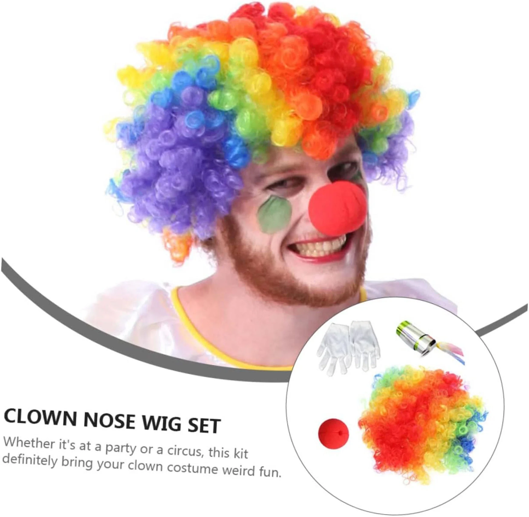 - Malzeme: Saç: Sentetik fiber, Burun: Yumuşak plastik, Eldiven: Polyester, Baston: Plastik