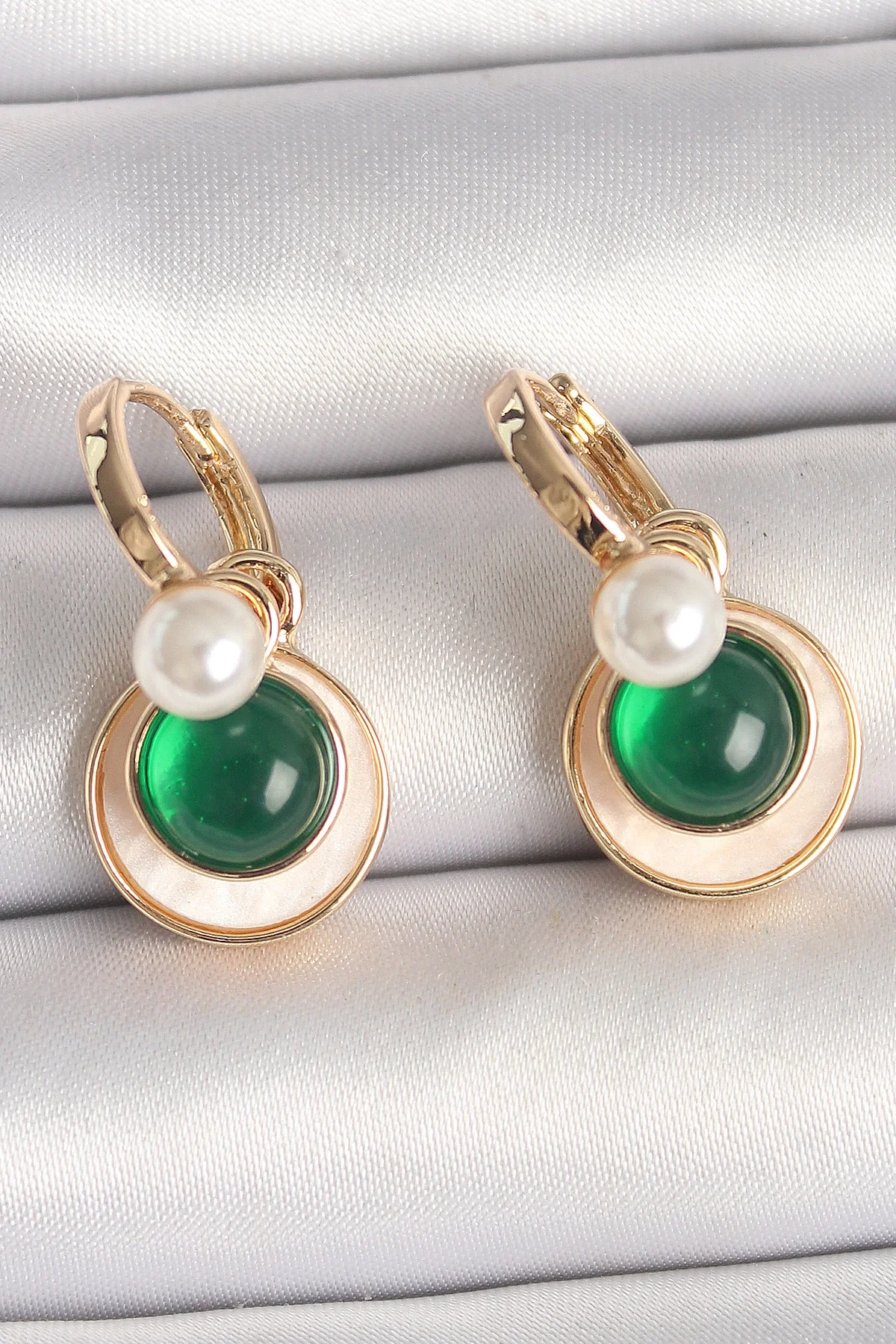 Pirinç Gold Renk Beyaz Yeşil Sallantı Mineli Kadın Küpe