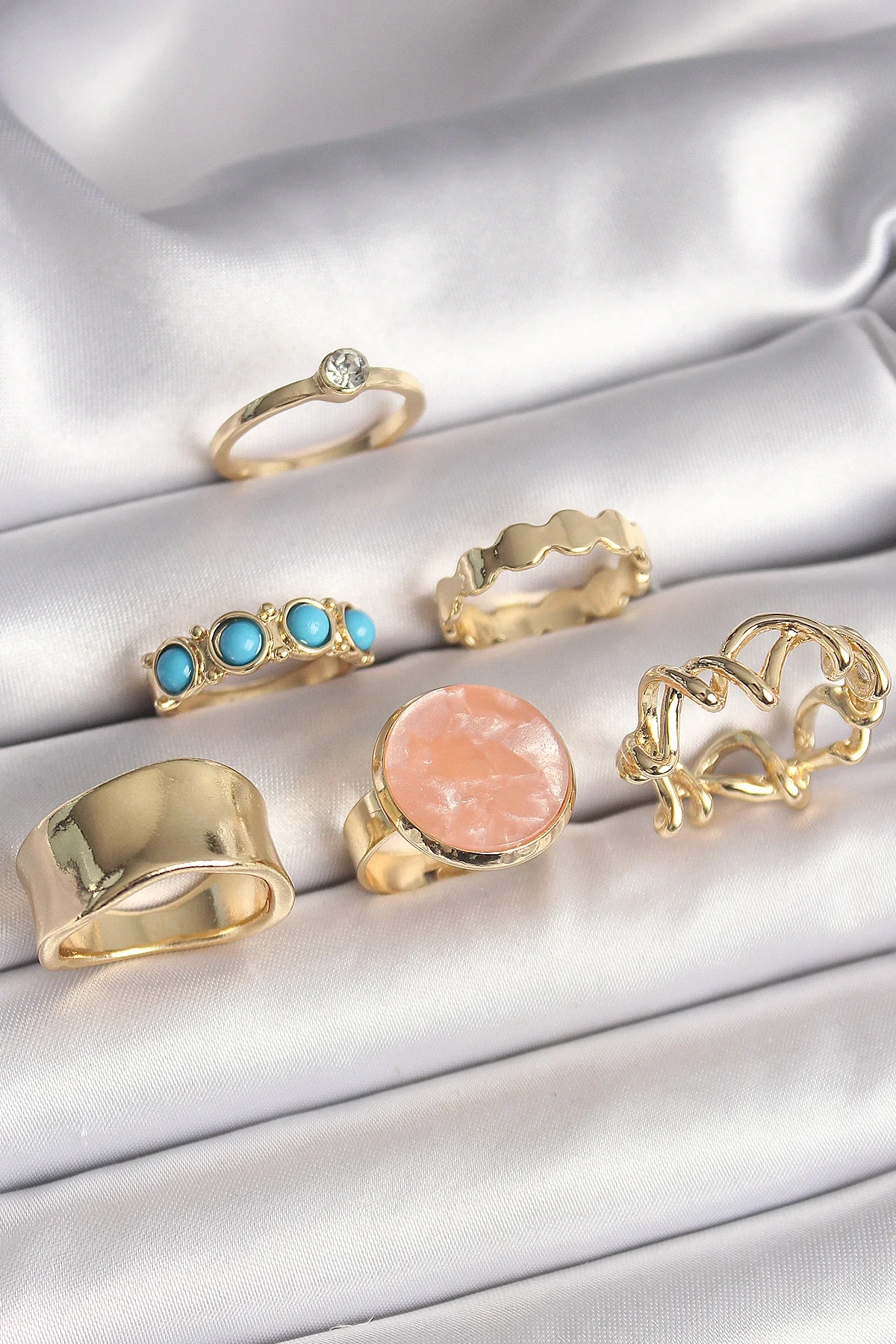 Pirinç Gold Renk Daire Pembe Mineli Zirkon Taş Detaylı 6'Lı Kadın Yüzük Seti