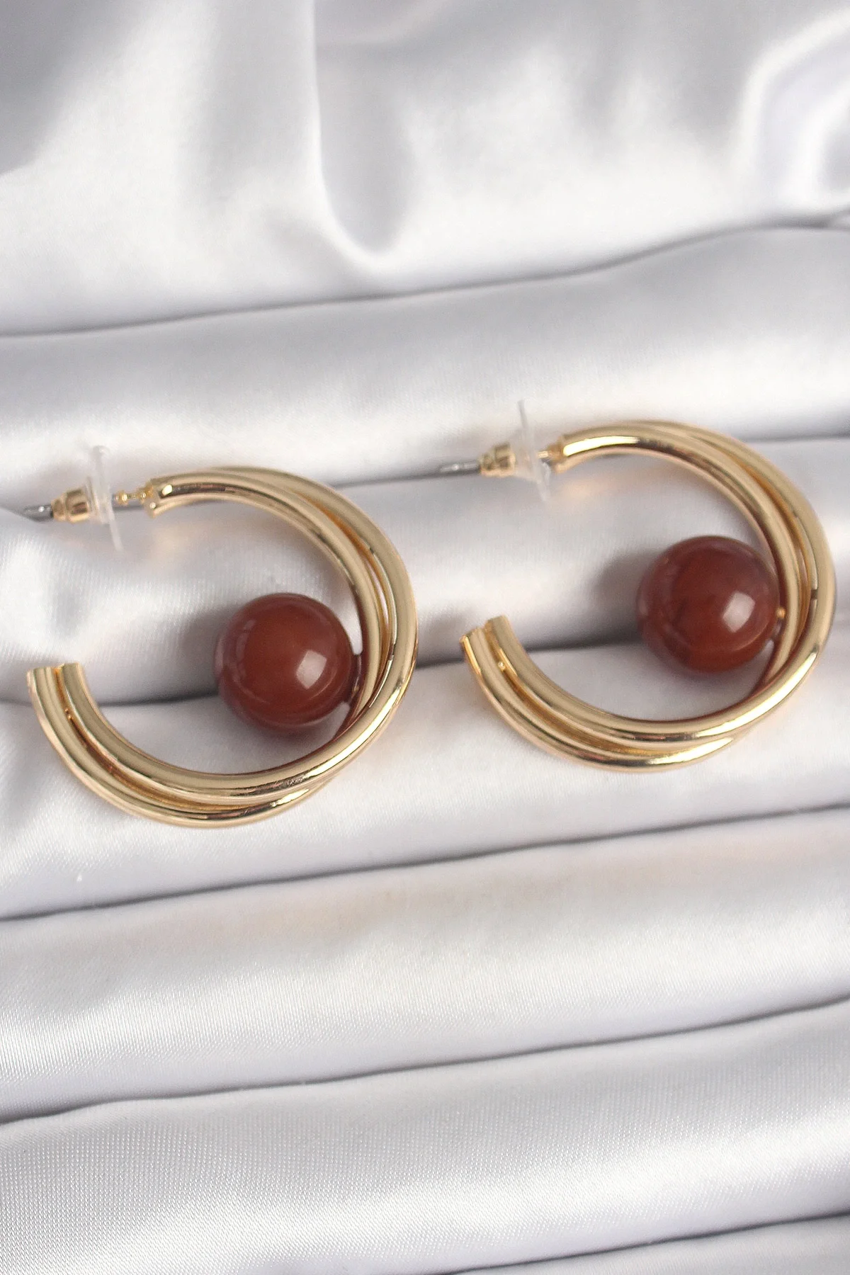 Pirinç Gold Renk Halka Model Kahverengi Boncuk Detay Kadın Küpe