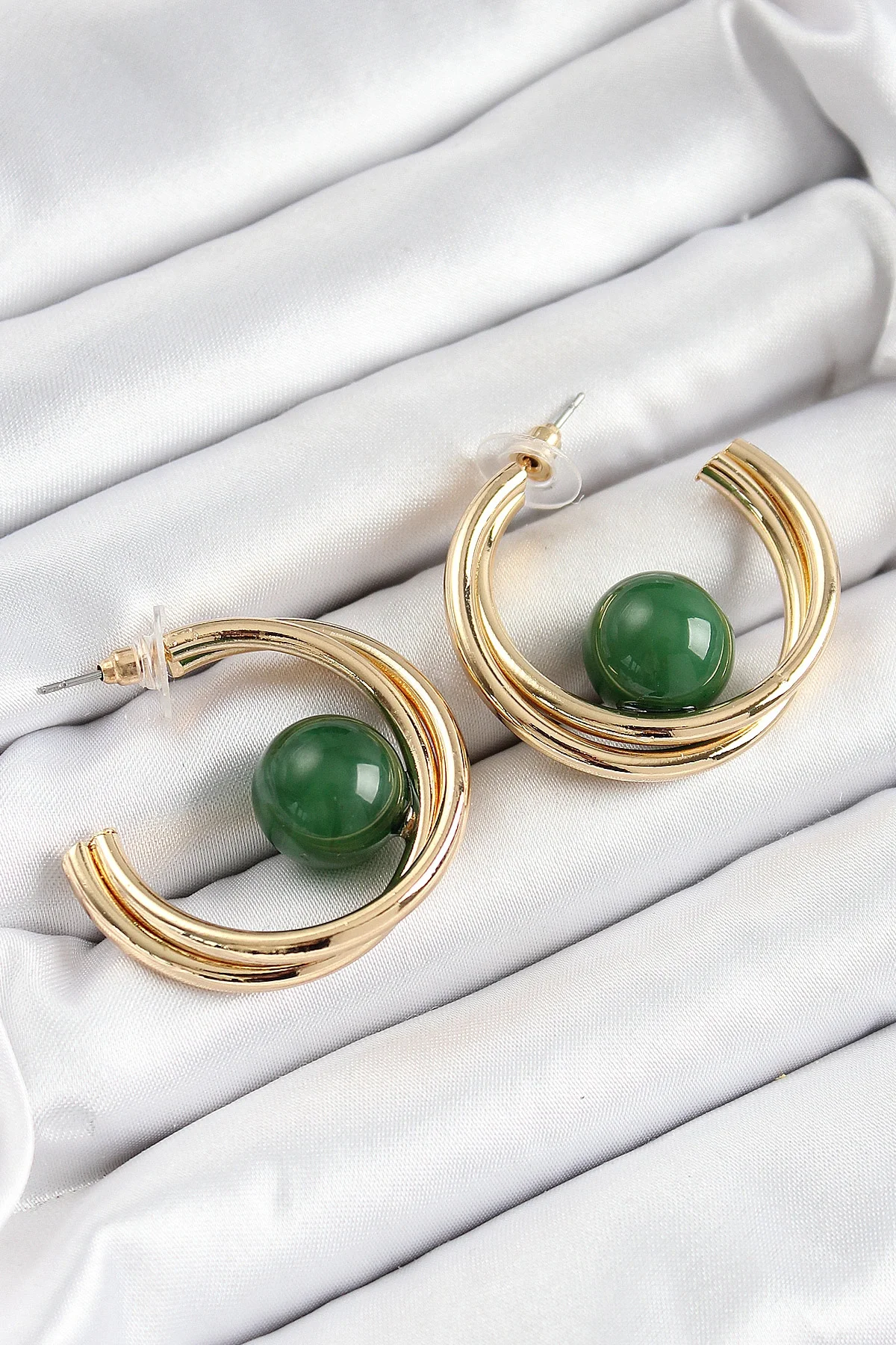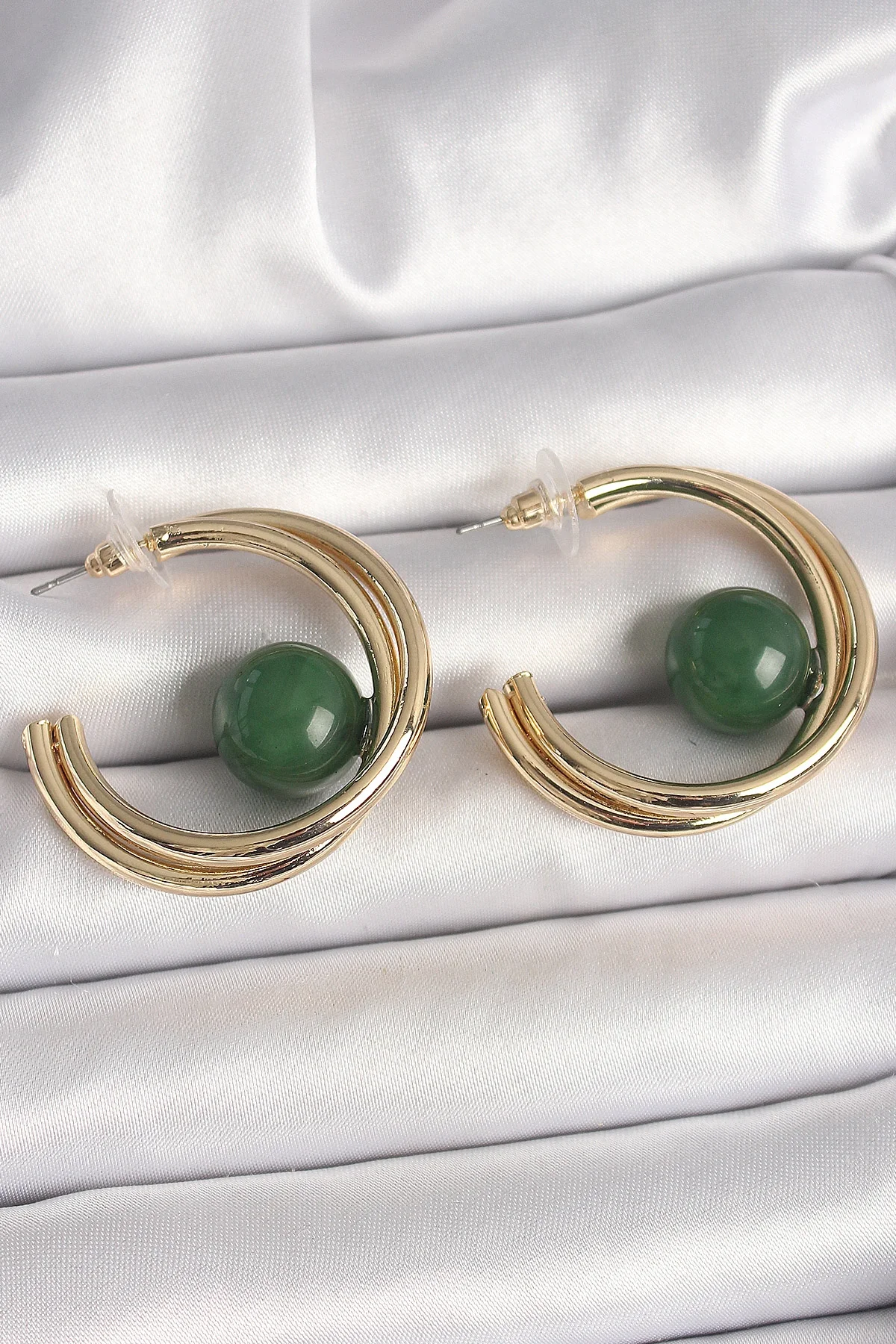 Pirinç Gold Renk Halka Model Yeşil Boncuk Detay Kadın Küpe