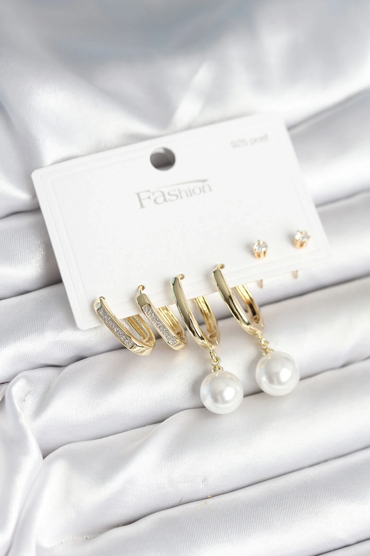 Pirinç Gold Renk İnci Detaylı 925 Ayar Gümüş Çivili Kadın Küpe Seti