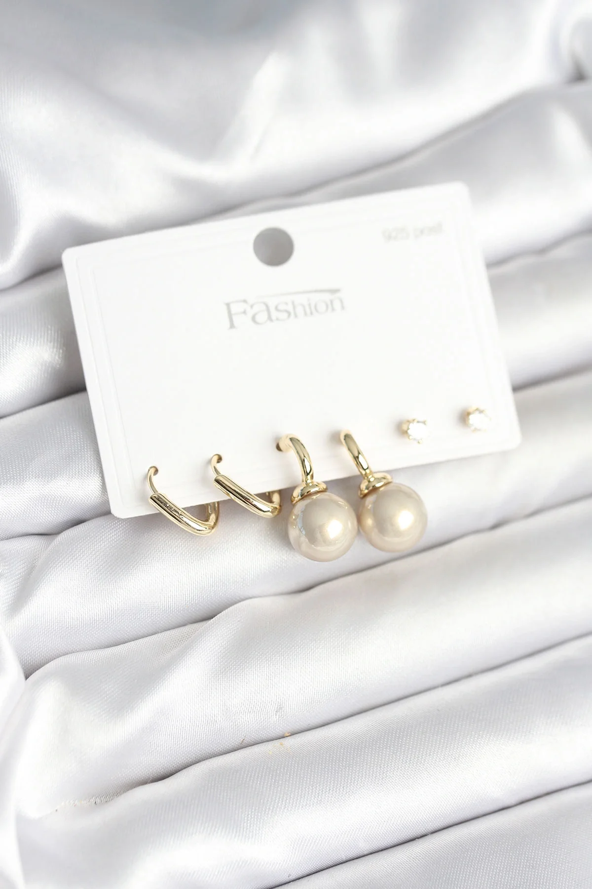 Pirinç Gold Renk İnci Detaylı 925 Gümüş Çivili Kadın Küpe Seti