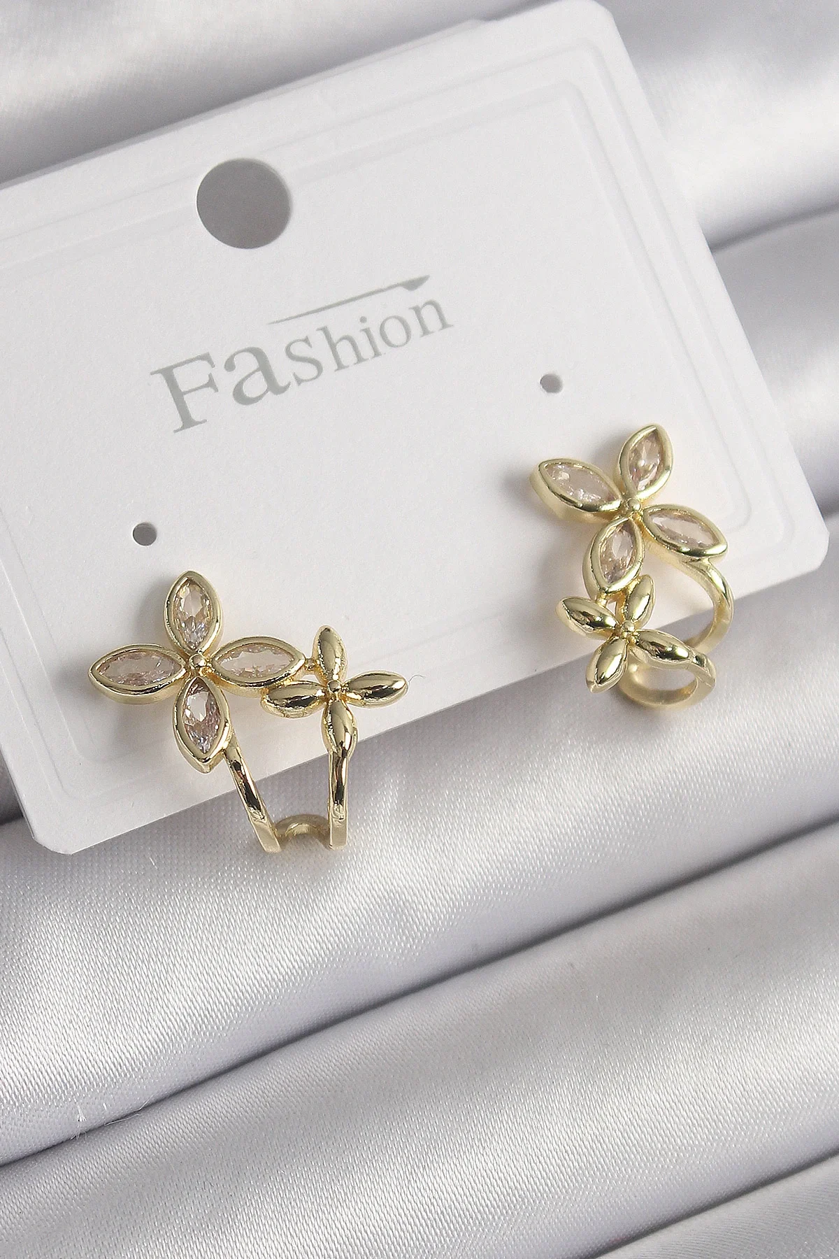 Pirinç Gold Renk Zirkon Taşlı 2'Li Çiçek Model Kadın Küpe