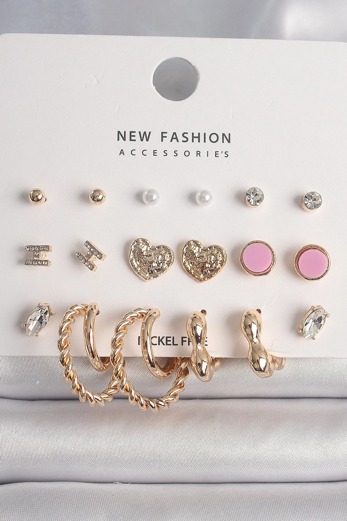 Pirinç Gold Renk Zirkon Taşlı Burug Halka Model İşlemeli Kalp Detay 9 Çift Kadın Küpe Seti