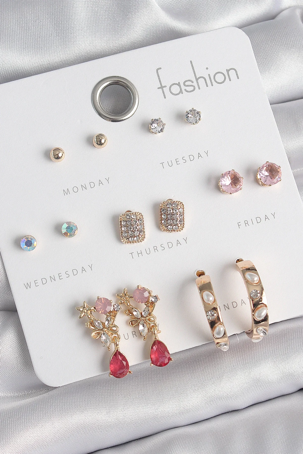 Pirinç Gold Renk Zirkon Taşlı Çiçek Figür İncili Halka Figür 7 Çift Kadın Küpe Seti