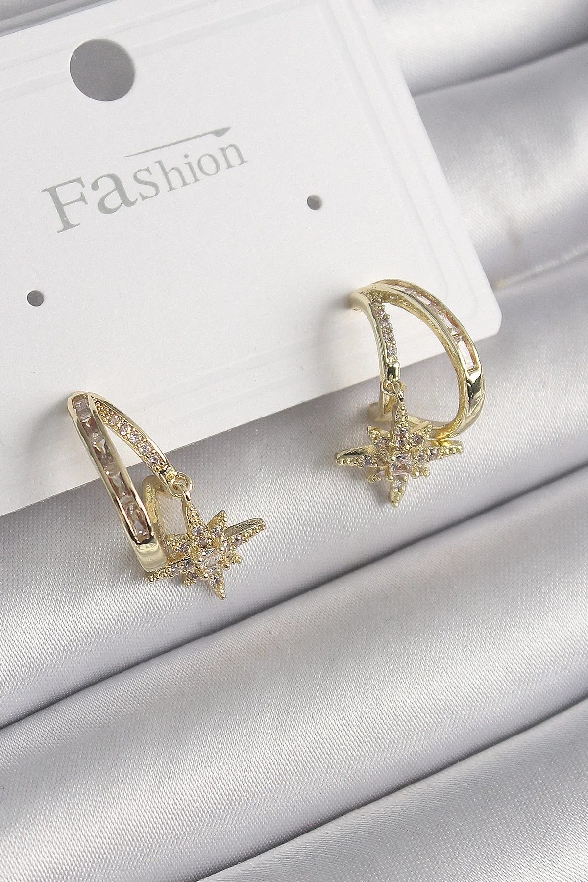 Pirinç Gold Renk Zirkon Taşlı Halka Model Yıldız Detay Kadın Küpe