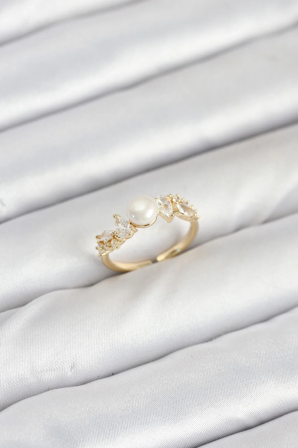 Pirinç Gold Renk Zirkon Taşlı İncili Model Kadın Yüzük
