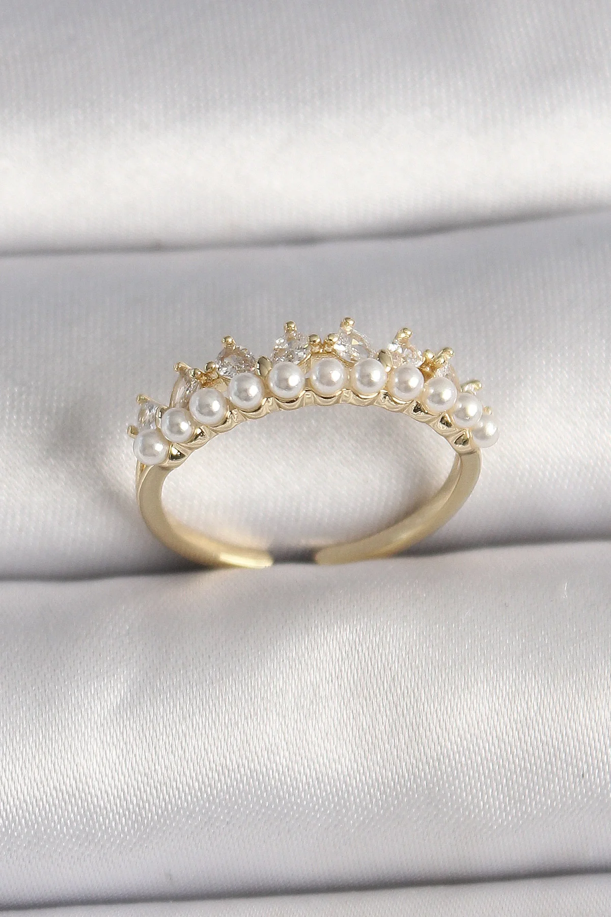 Pirinç Gold Renk Zirkon Taşlı İncili Taç Model Ayarlanabilir Kadın Yüzük