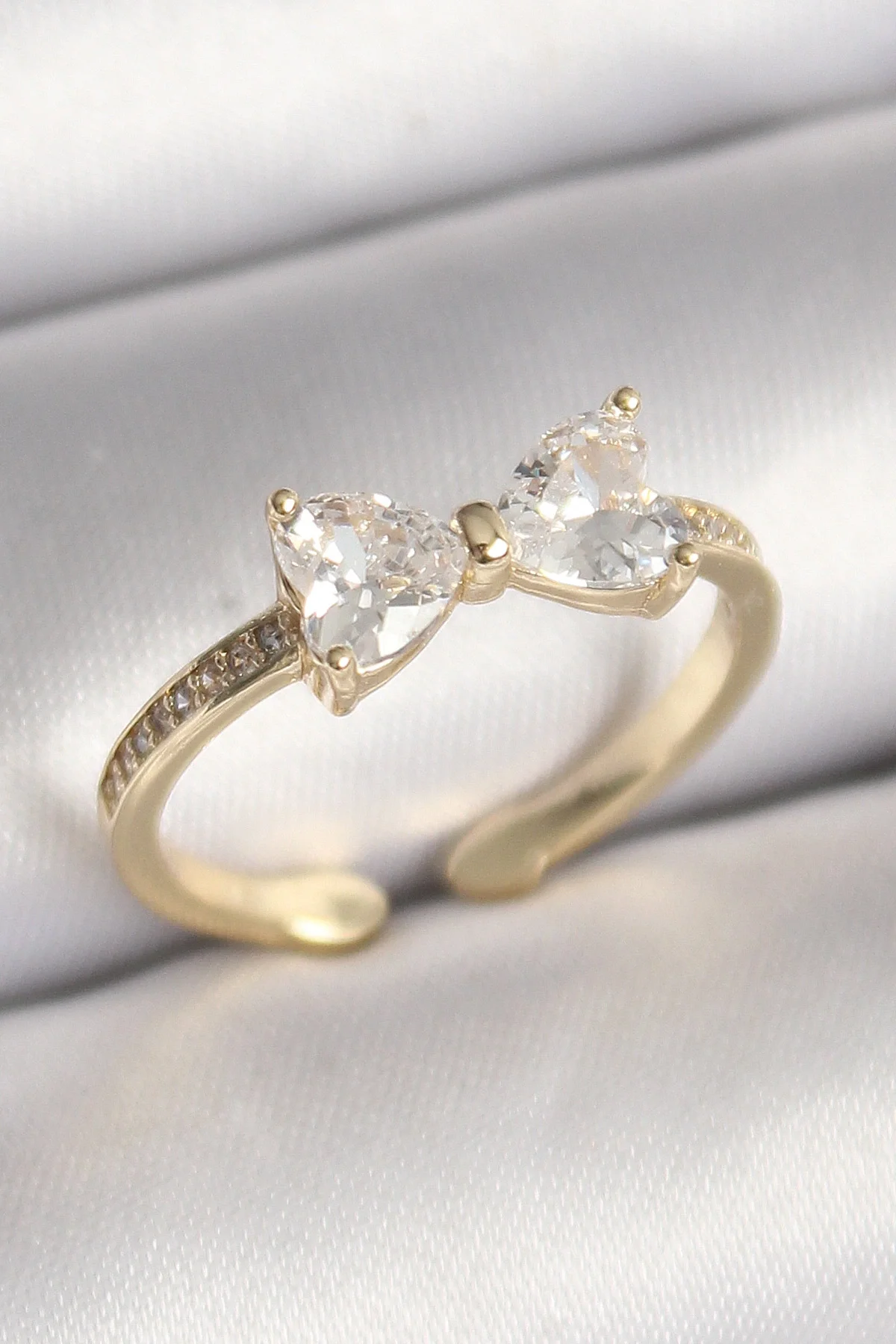 Pirinç Gold Renk Zirkon Taşlı Kalp Fiyonk Model Kadın Yüzük