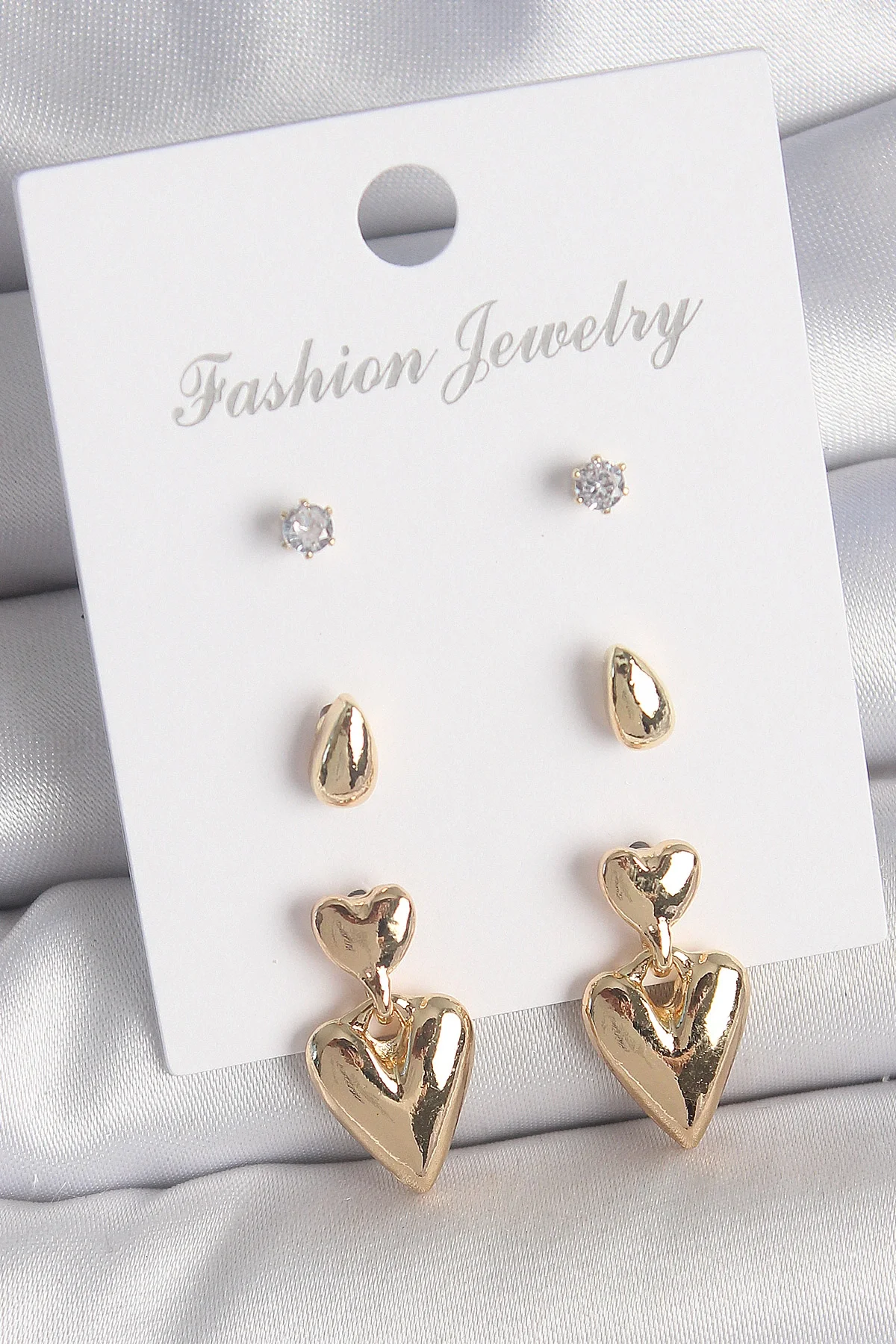 Pirinç Gold Renk Zirkon Taşlı Sallantılı Kalp Model 3 Çift Kadın Küpe Seti