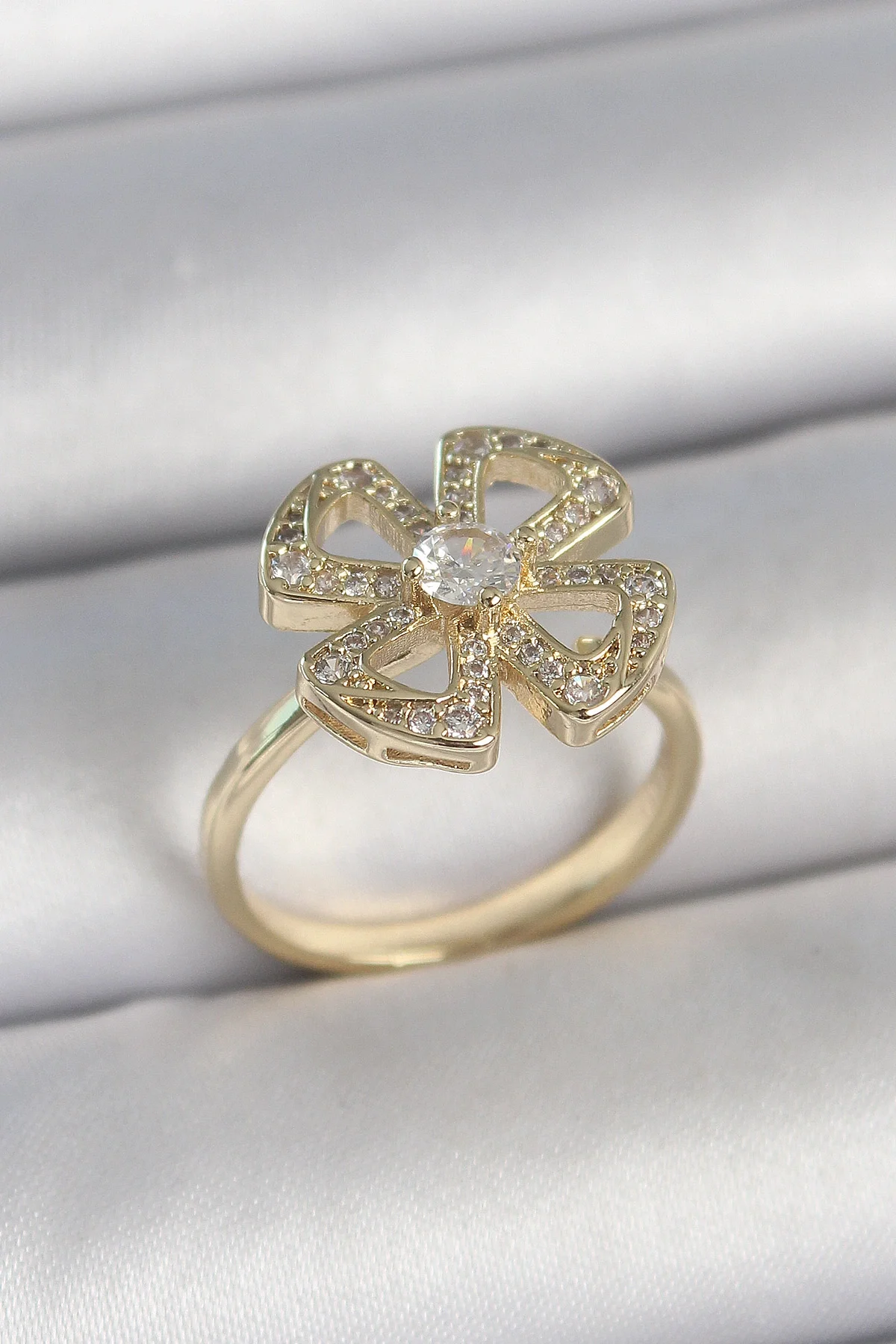 Pirinç Gold Renk Zirkon Taşlı Yonca Model Ayarlanabilir Kadın Yüzük
