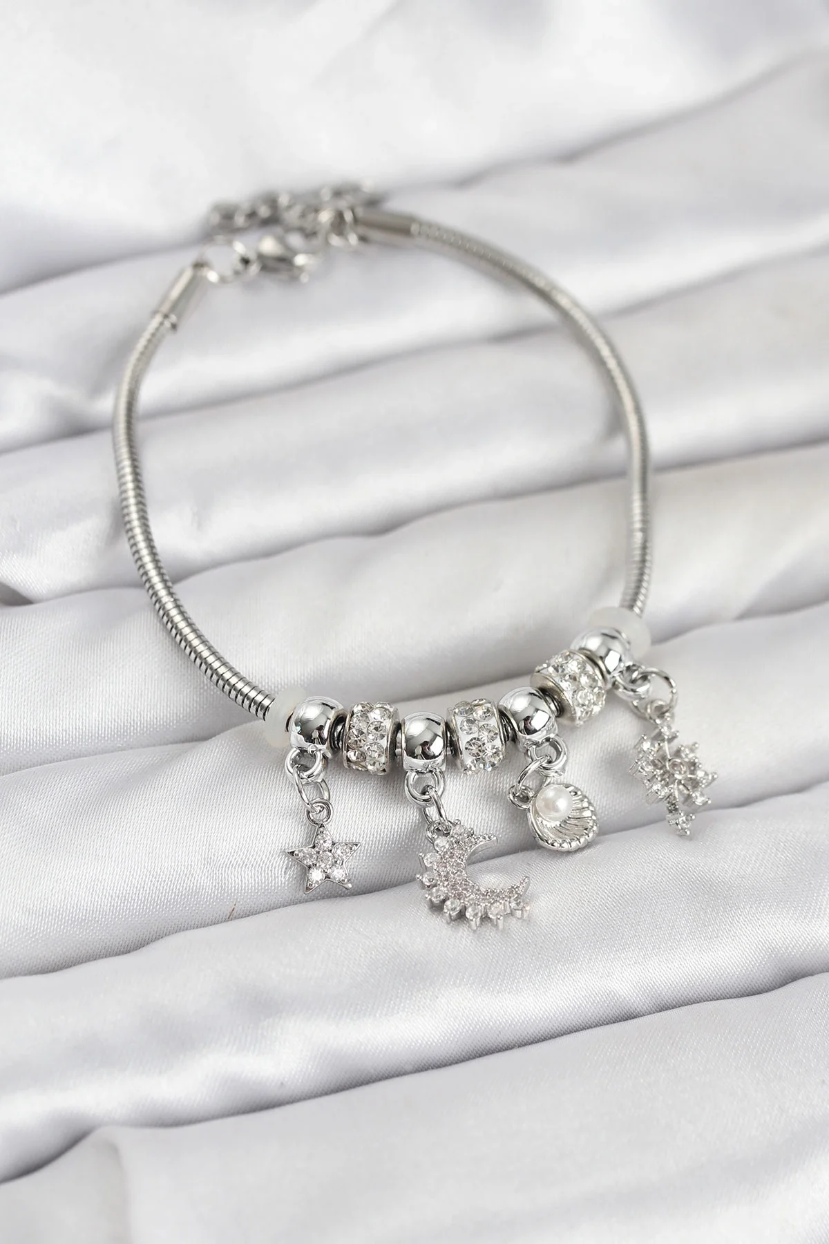 Pirinç Gümüş Renk Ay Charm Model Charmlı Kadın Bileklik