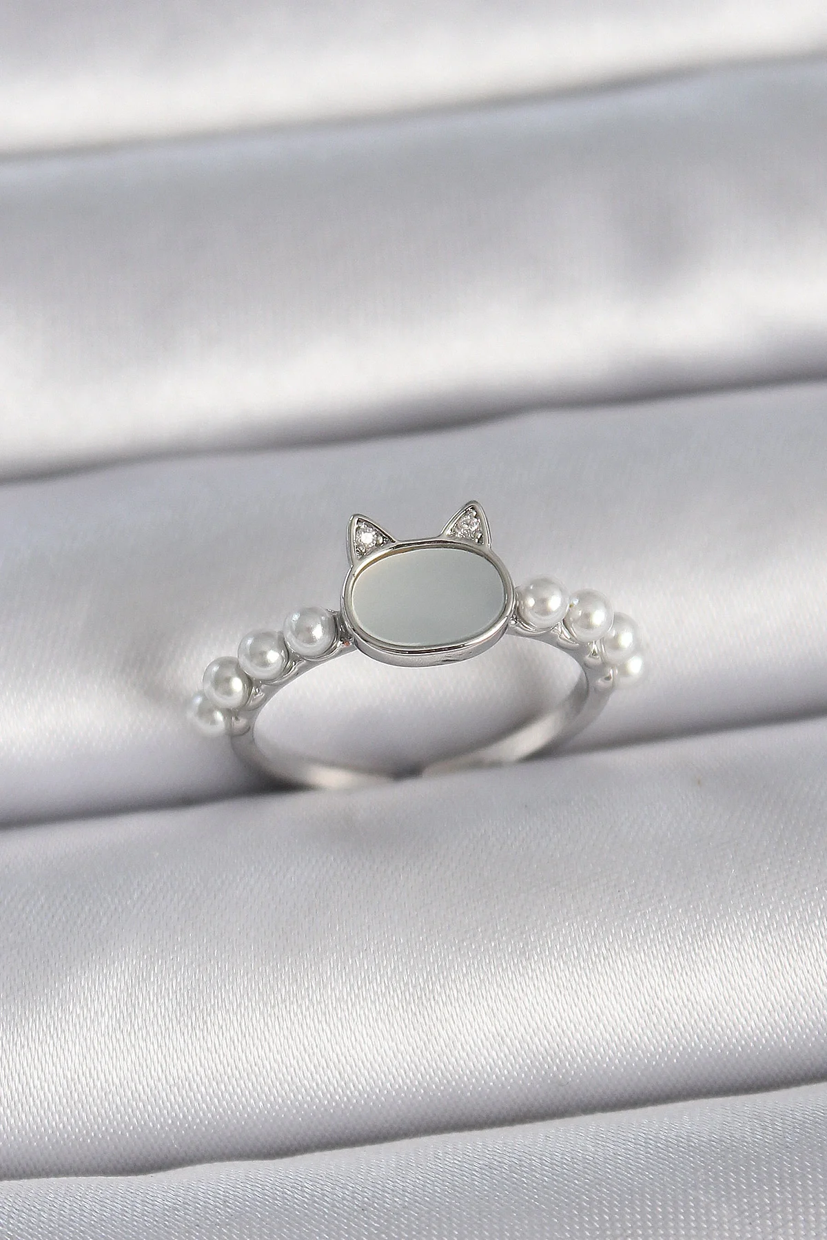 Pirinç Gümüş Renk Ayarlanabilir Beyaz Mineli Kedi Model İnci Detay Kadın Yüzük