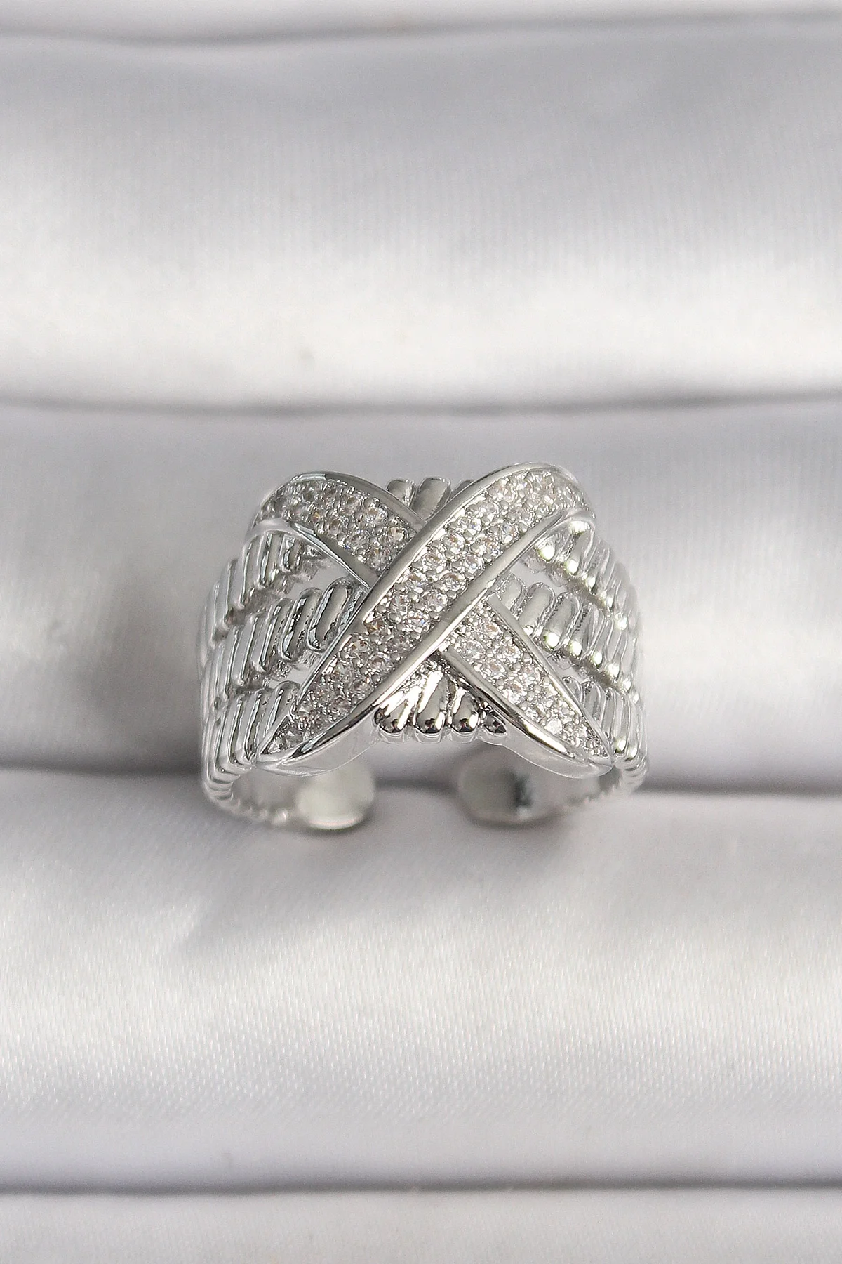 Pirinç Gümüş Renk Ayarlanabilir Zirkon Taşlı X Model Kadın Yüzük