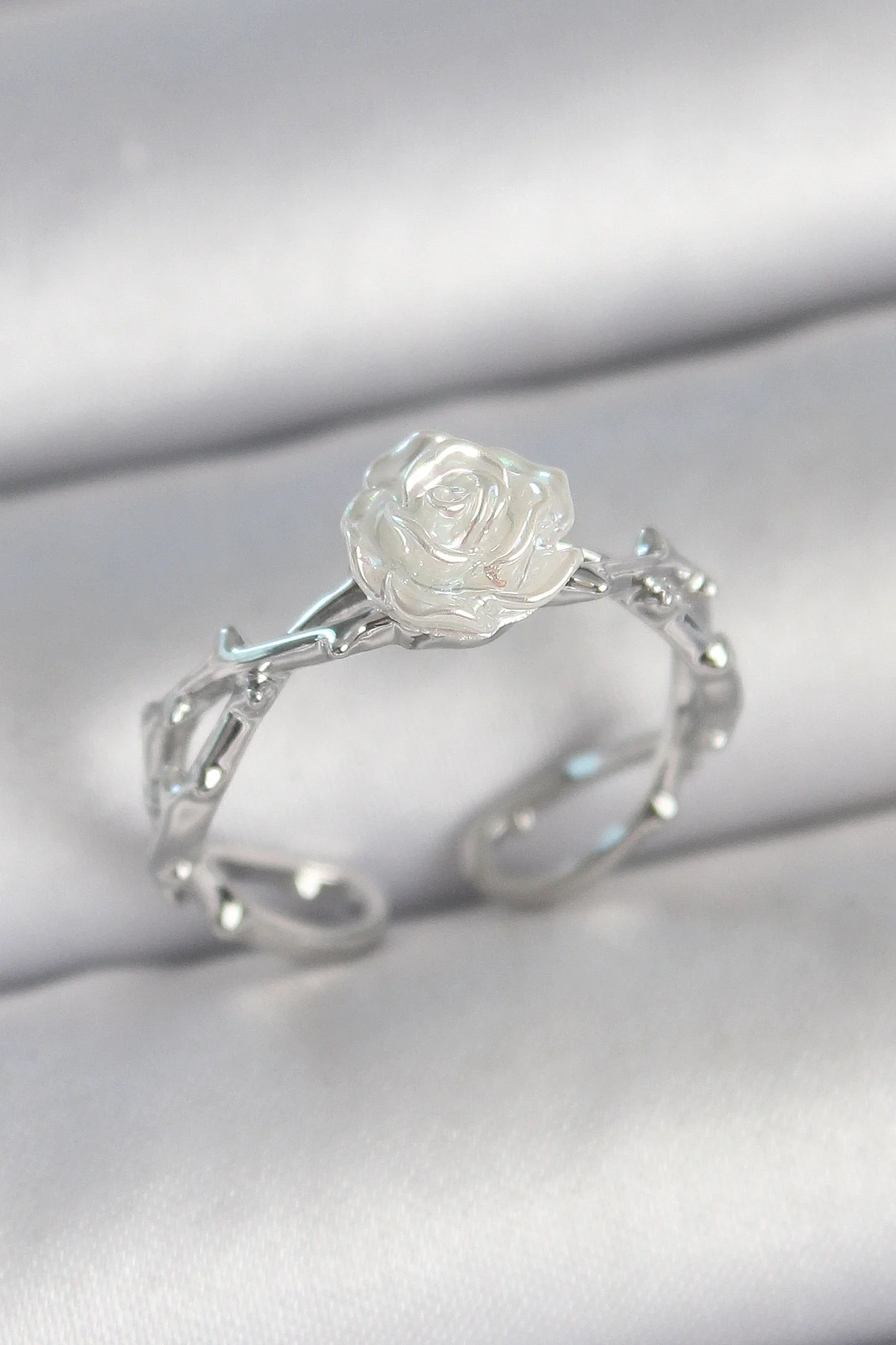 Pirinç Gümüş Renk Beyaz Gül Model Ayarlanabilir Kadın Yüzük