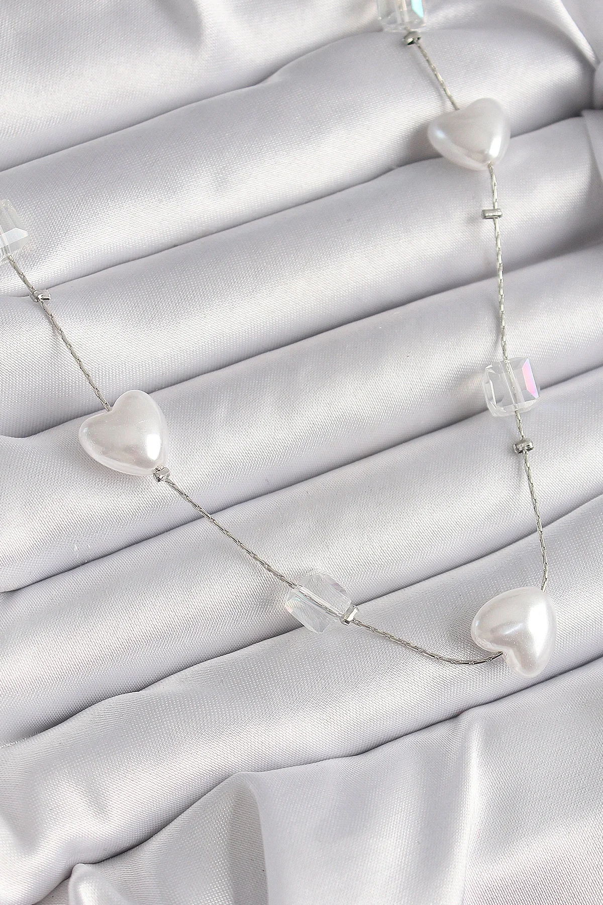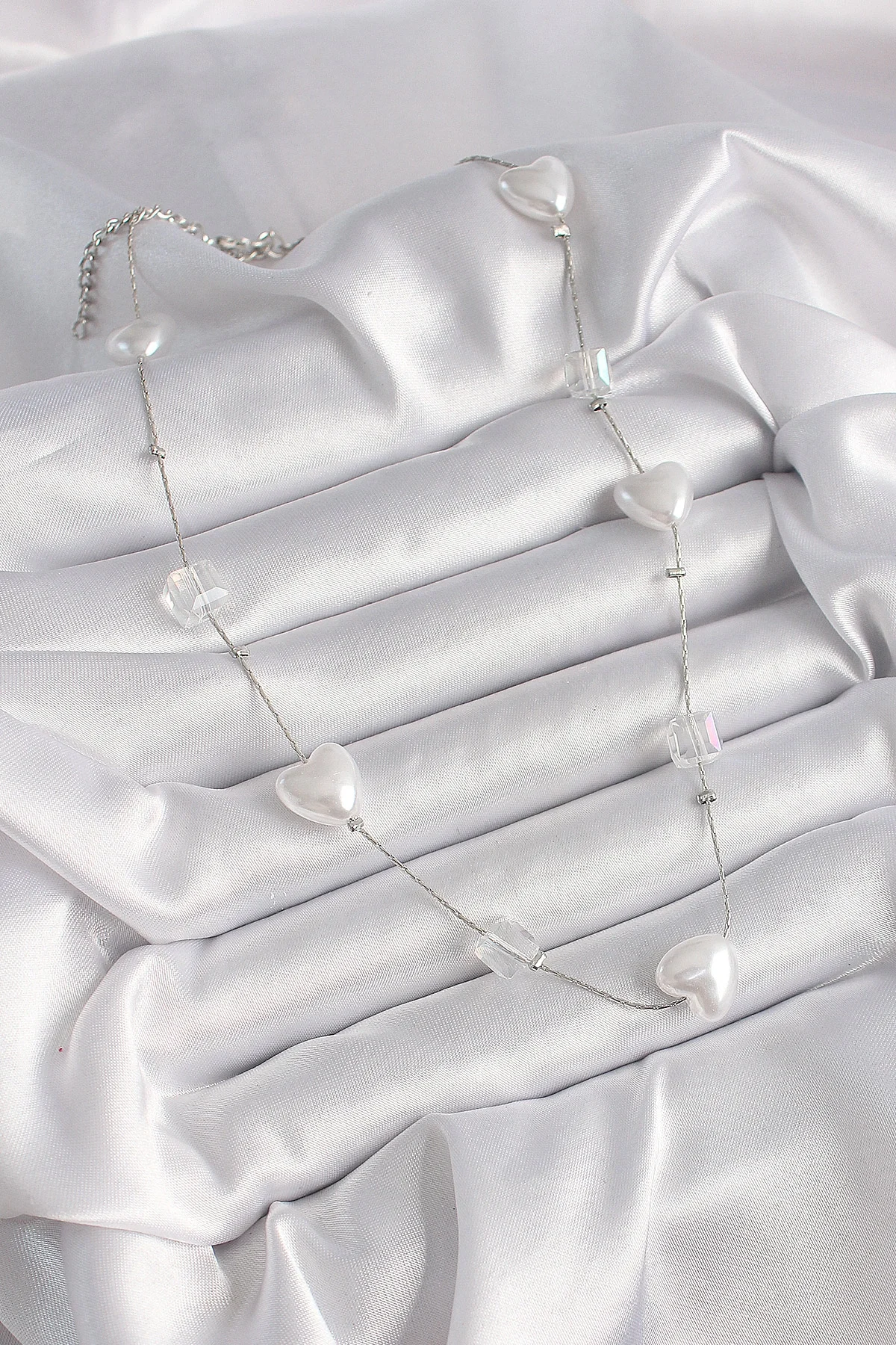 Pirinç Gümüş Renk Beyaz İnci Kalp Model Kadın Kolye