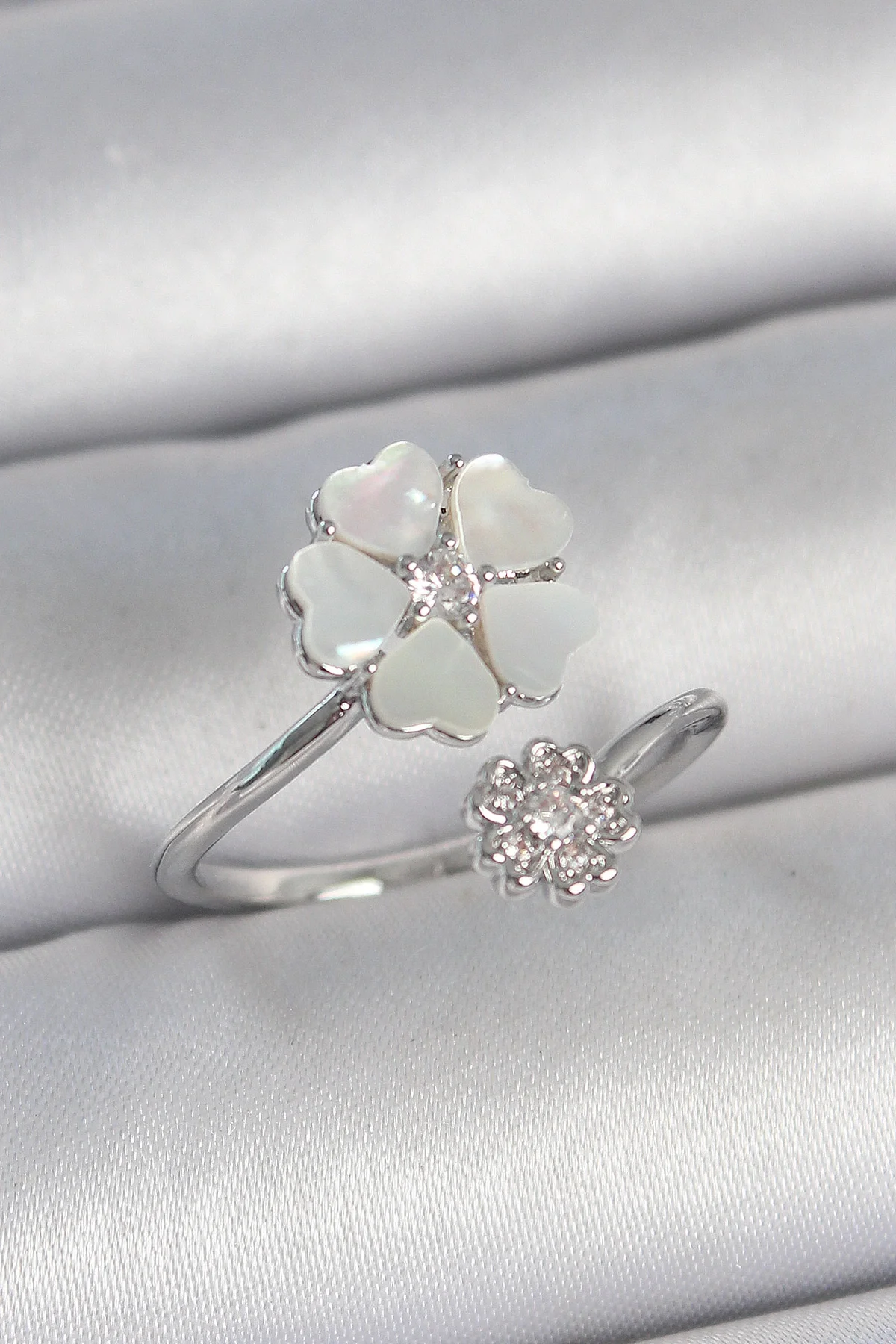 Pirinç Gümüş Renk Beyaz Mineli Çiçek Model Zirkon Taş Detay Kadın Yüzük