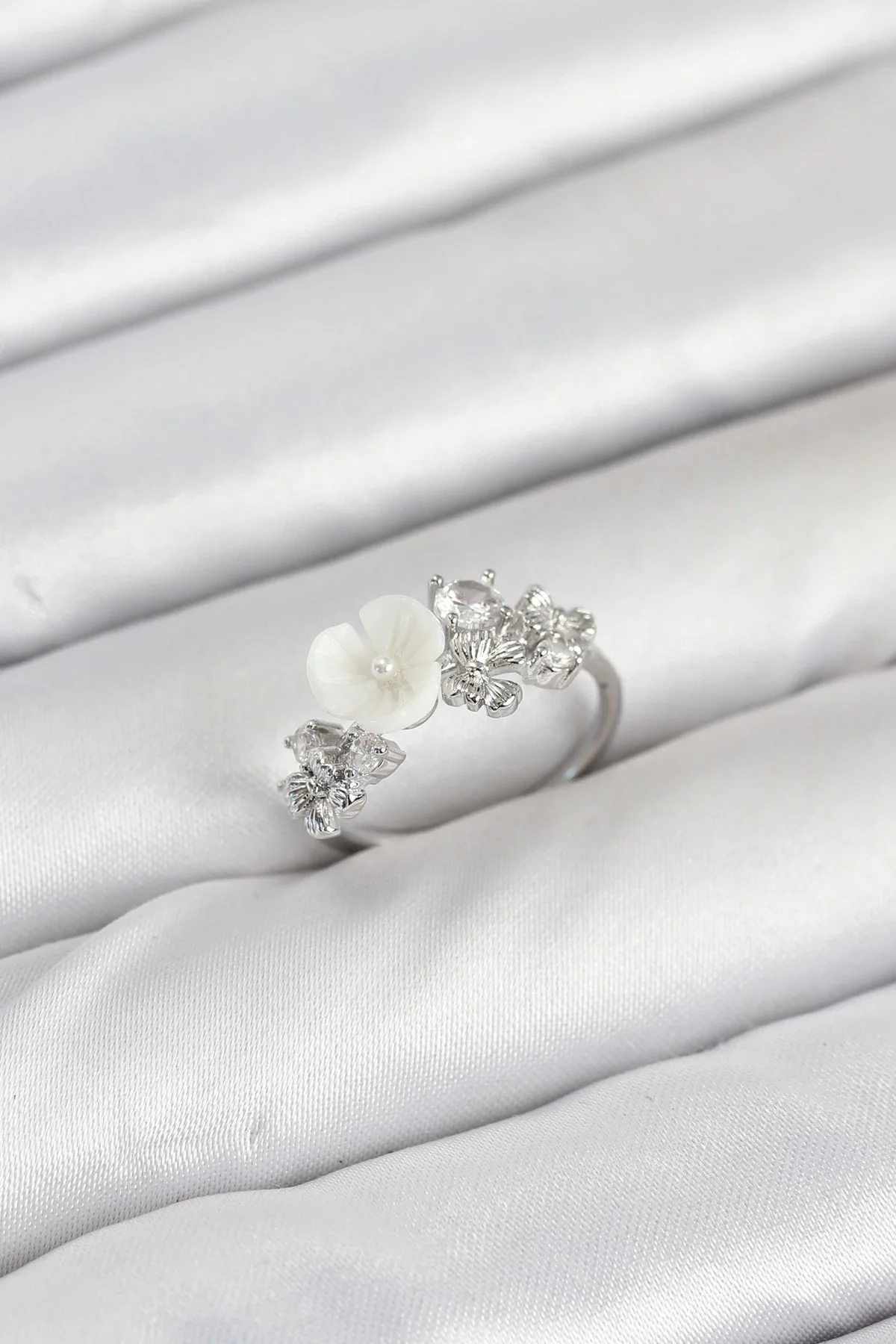 Pirinç Gümüş Renk Çiçek Model Zirkon Taşlı Kadın Yüzük