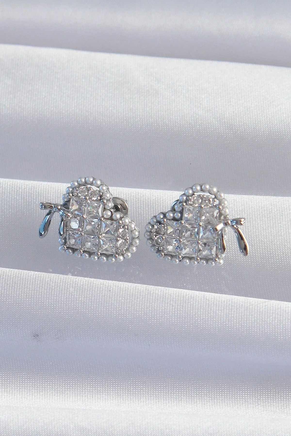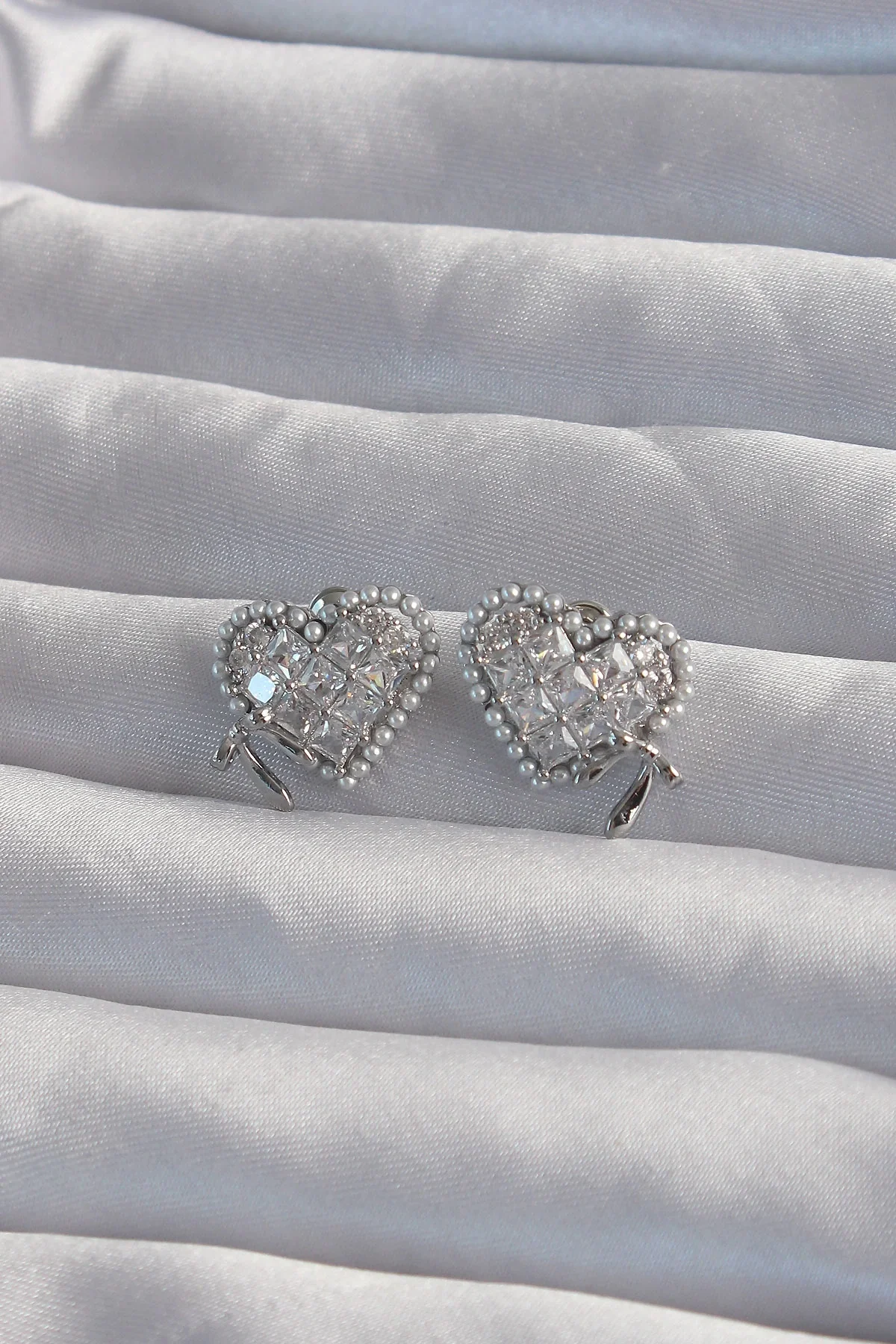 Pirinç Gümüş Renk Fiyonk Detay İncili Zirkon Taşlı Kalp Küpe