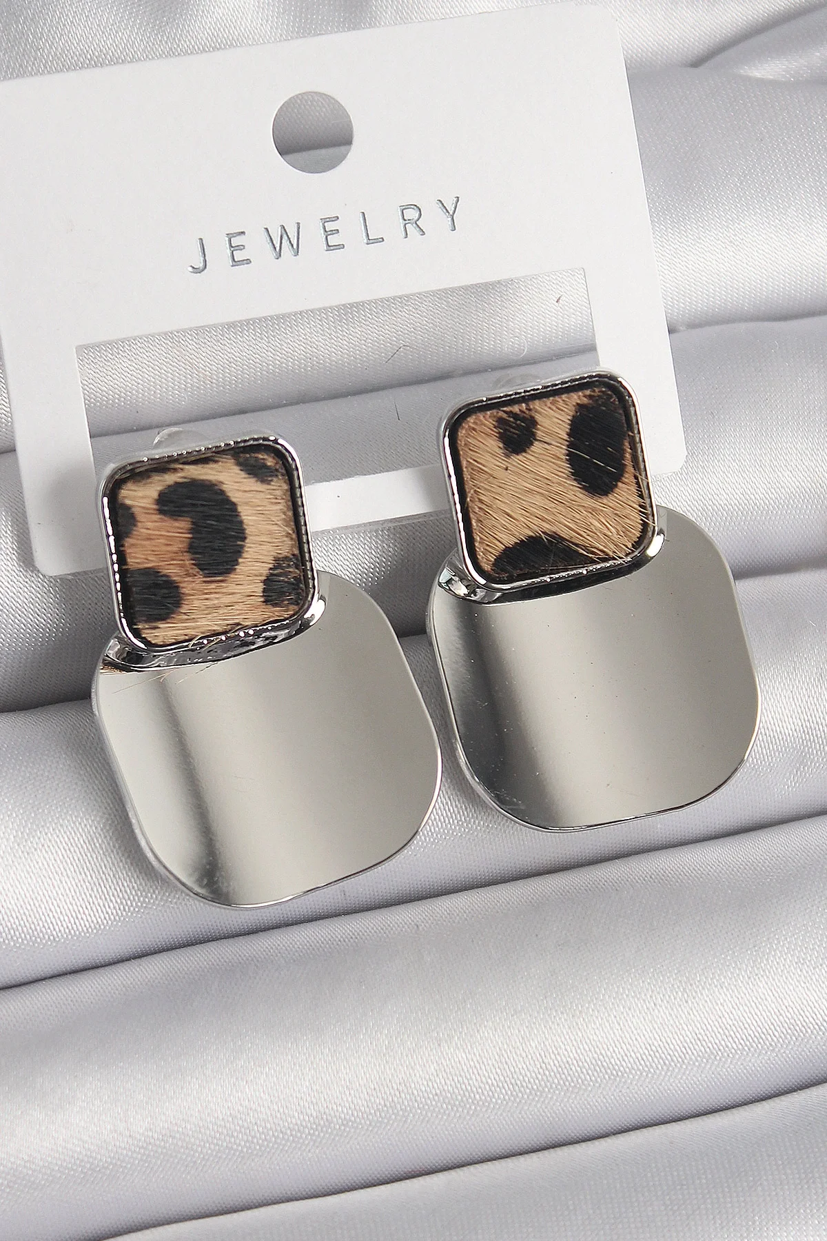 Pirinç Gümüş Renk Kare Plaka Leopar Desenli Kadın Küpe