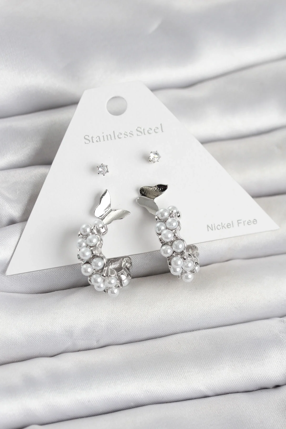 Pirinç Gümüş Renk Kelebek Detaylı Kadın Küpe Seti