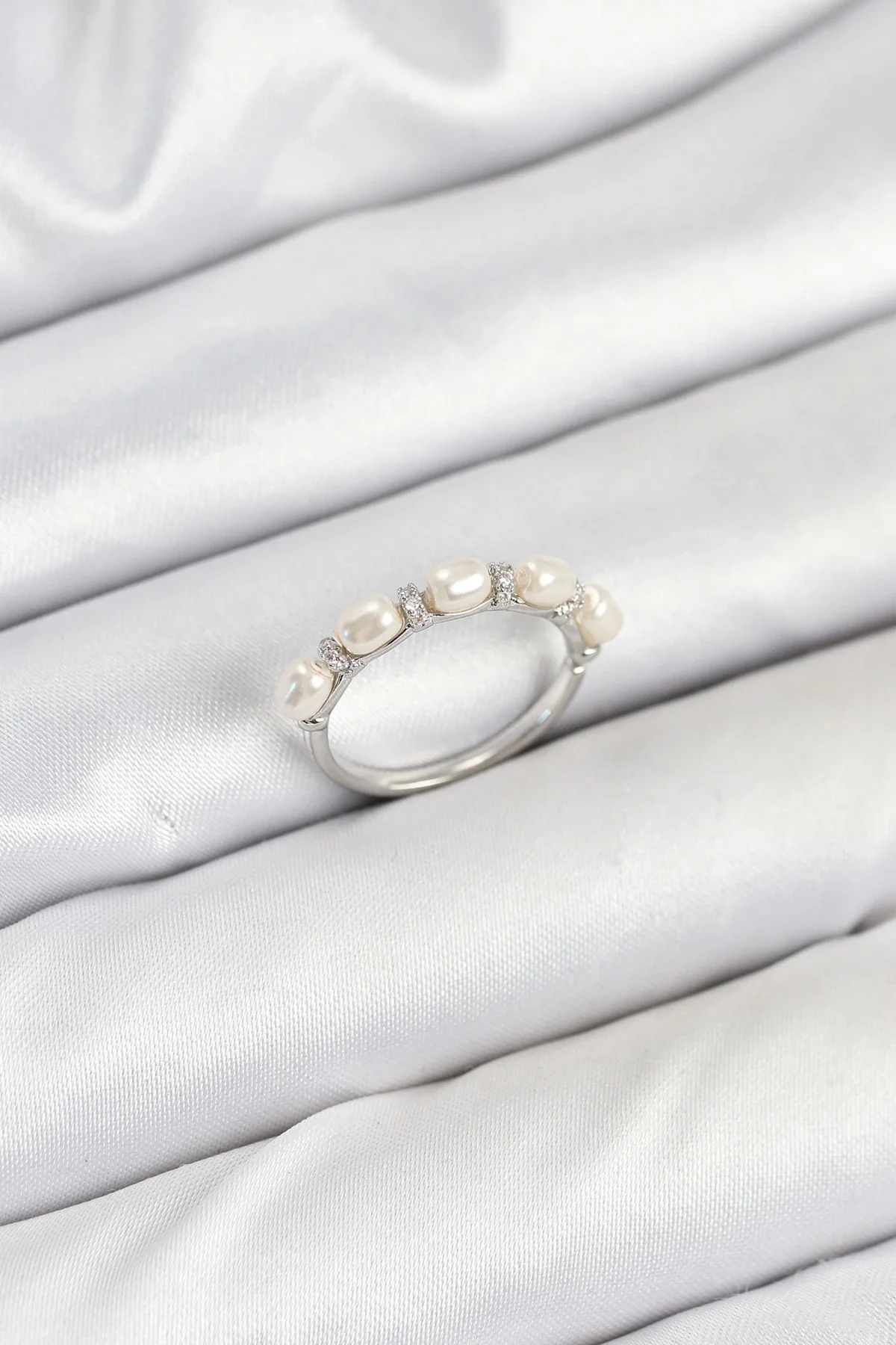 Pirinç Gümüş Renk Sıralı İncili Kadın Yüzük