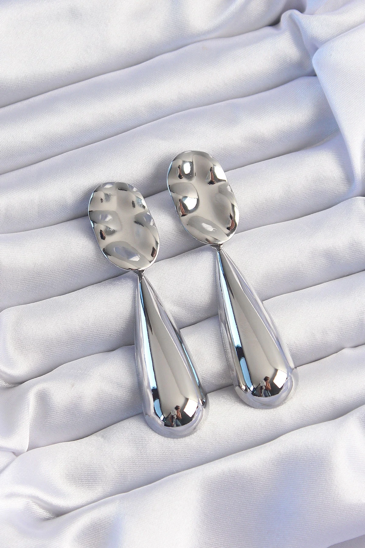 Pirinç Gümüş Renk Uzun Bombeli Ezme Plaka Küpe