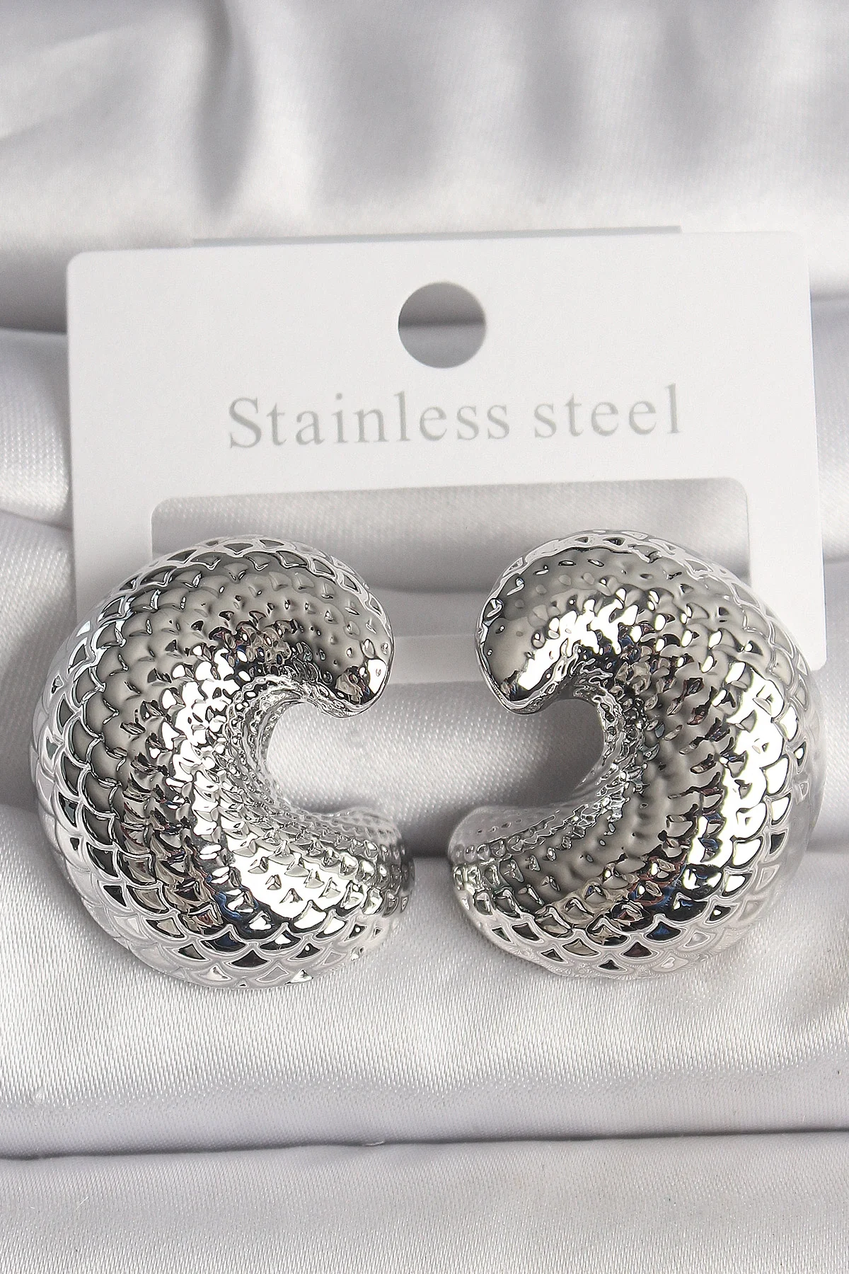 Pirinç Gümüş Renk Yılan Sırtı İşlemeli Yarım Halka Model Kadın Küpe