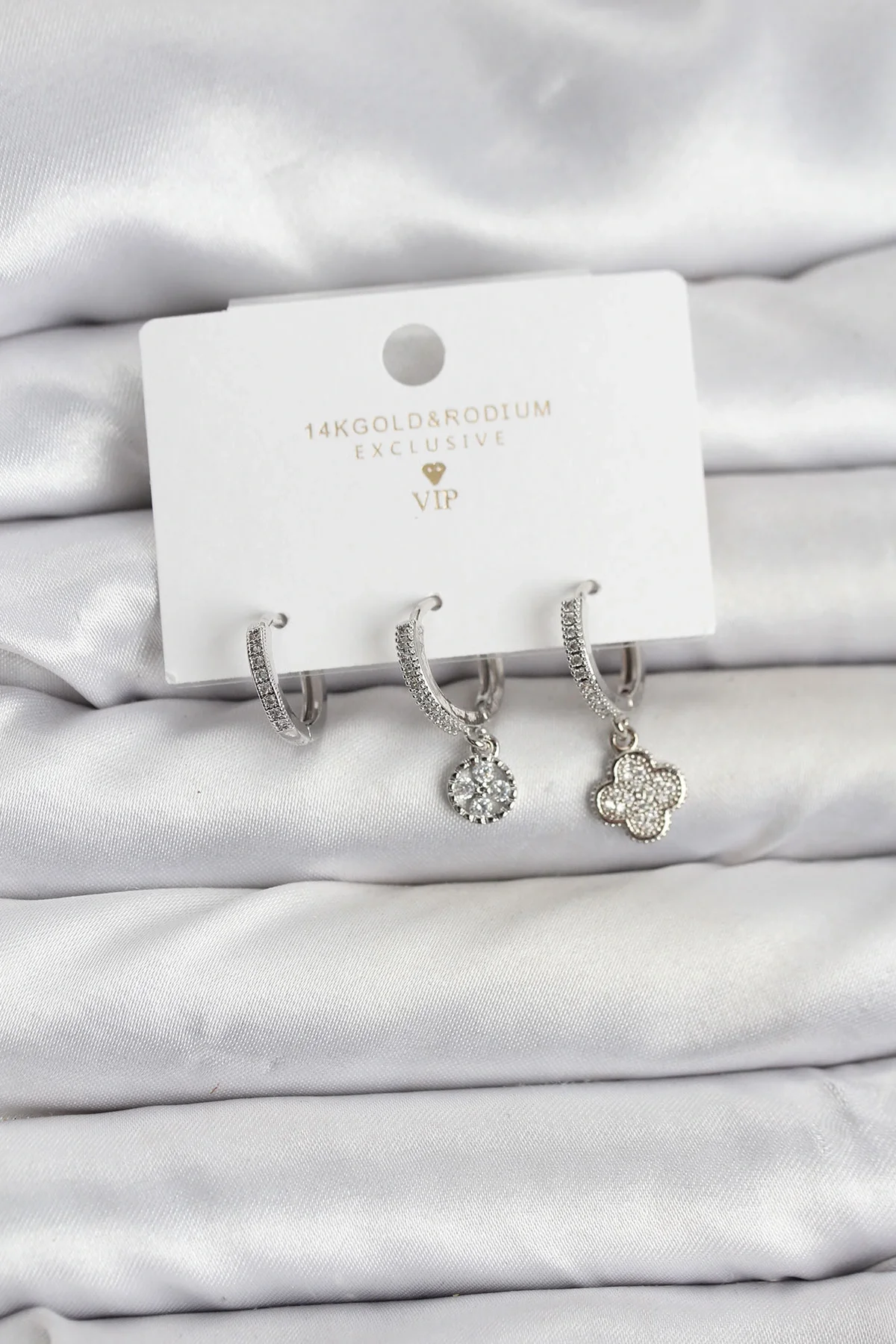 Pirinç Gümüş Renk Yonca Model 3'lü Kadın Küpe Seti