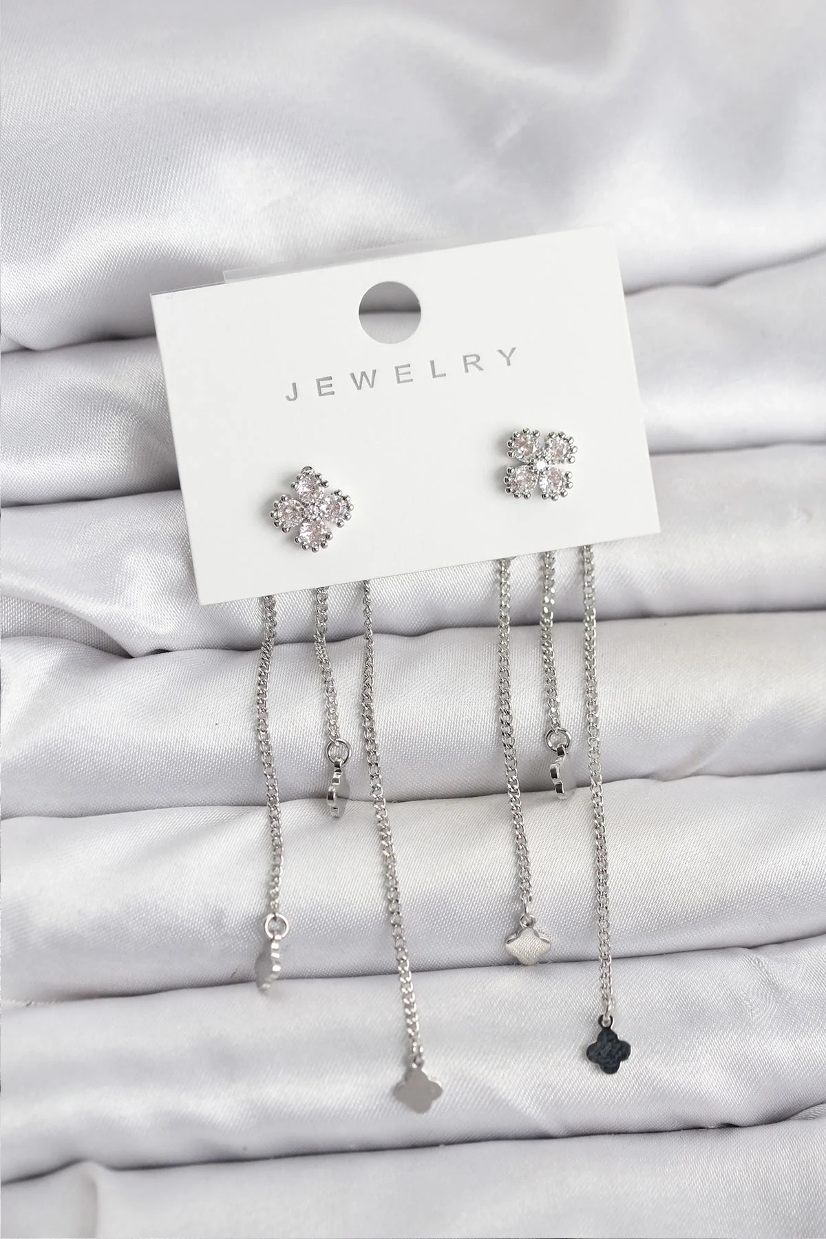 Pirinç Gümüş Renk Yonca Model Sallantılı Kadın Küpe