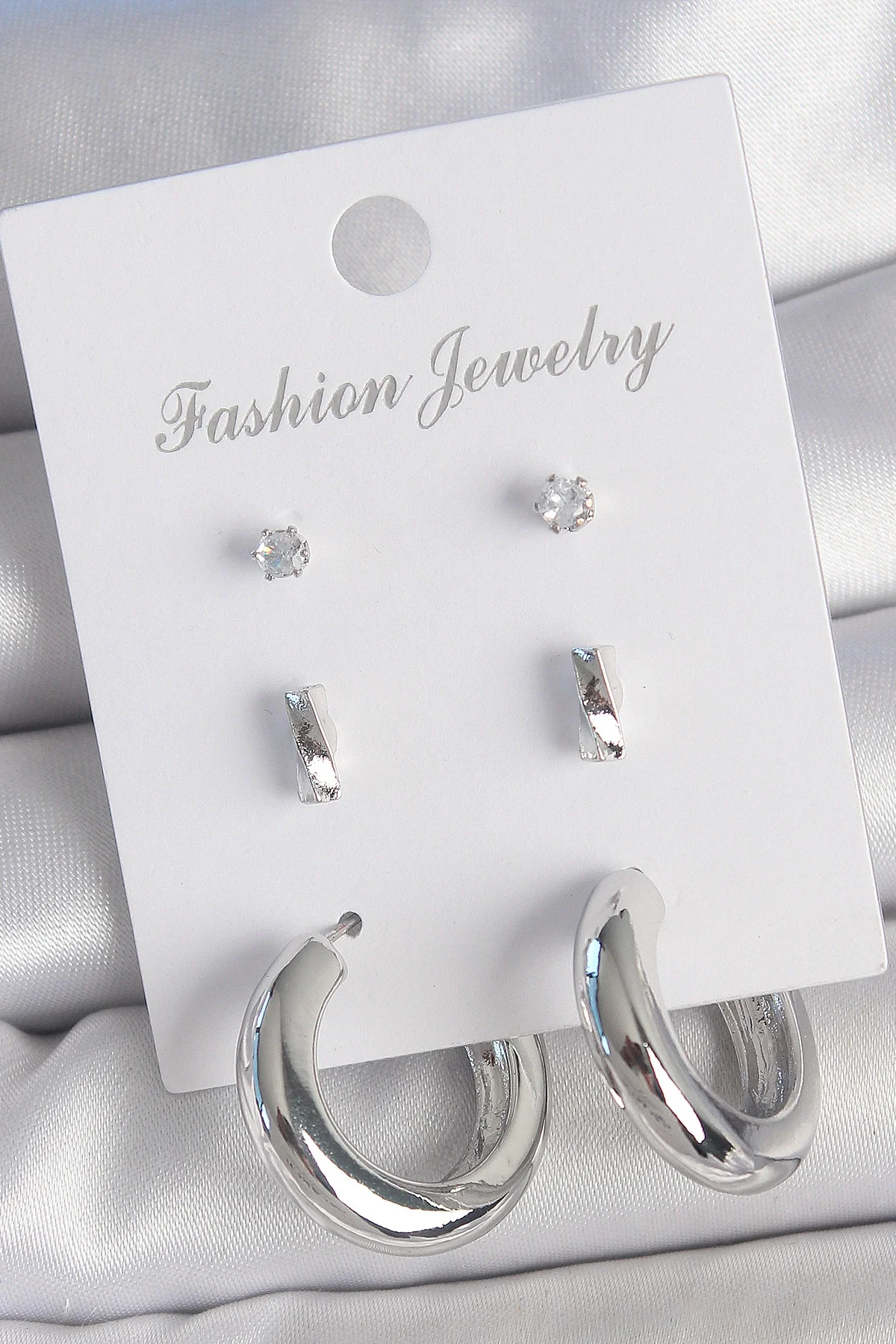 Pirinç Gümüş Renk Zirkon Taş Detay Halka Model 3 Çift Kadın Küpe Seti