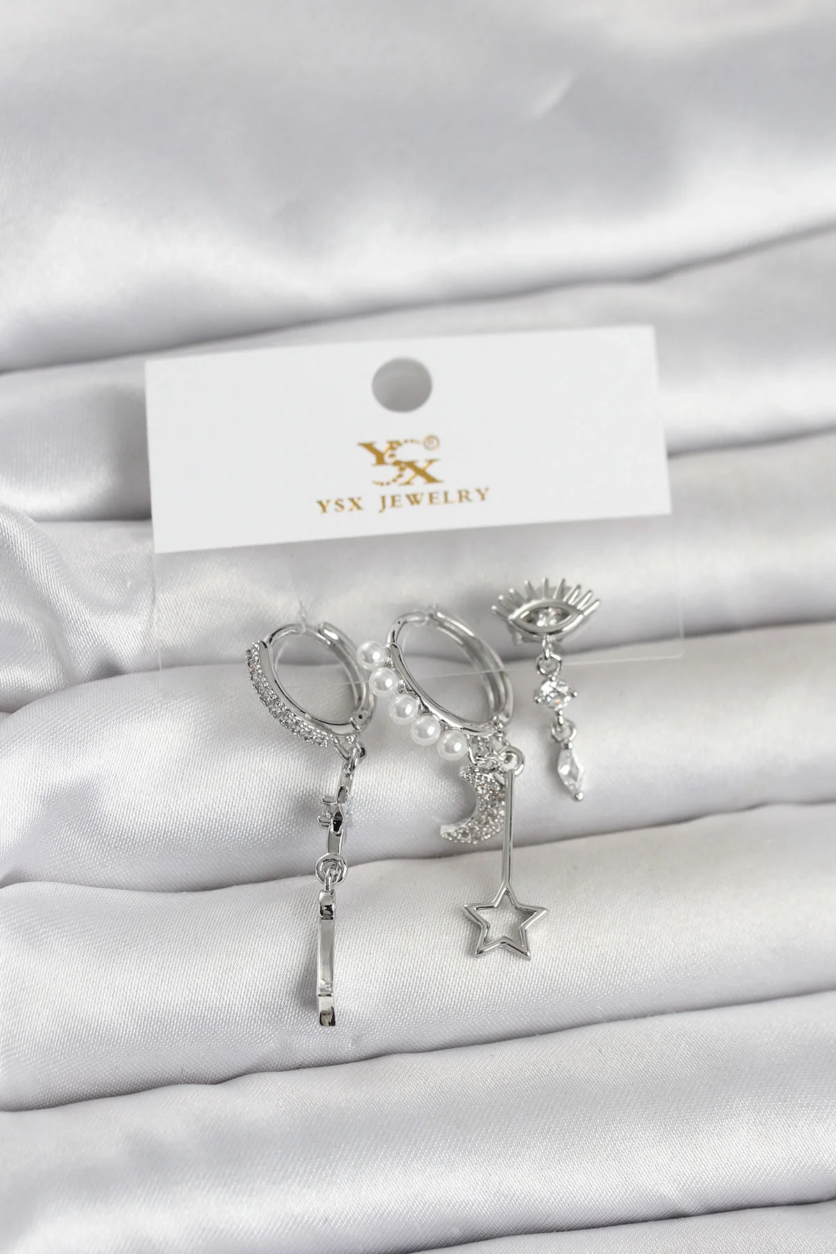 Pirinç Gümüş Renk Zirkon Taşlı Gece Temalı 3'lü Kadın Küpe
