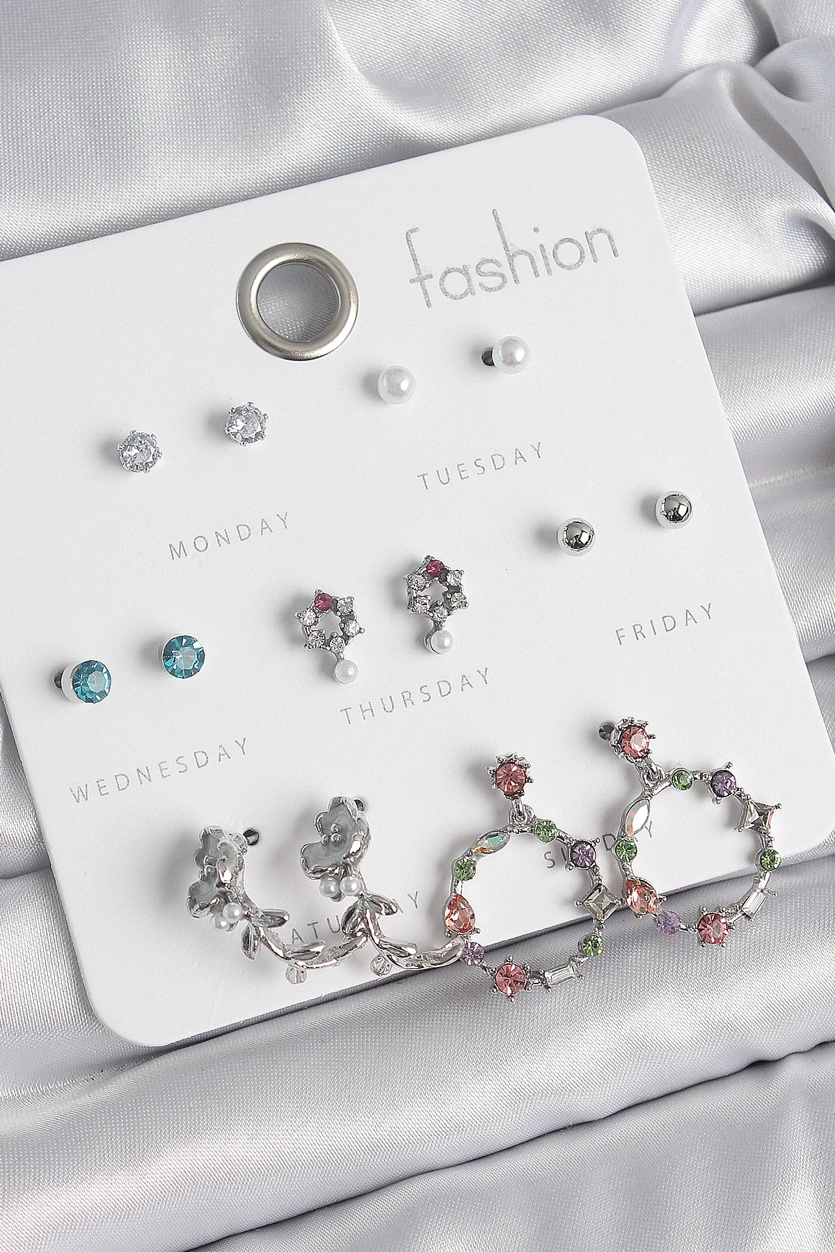 Pirinç Gümüş Renk Zirkon Taşlı Gül Figür Halka Model 7 Çift Kadın Küpe Seti