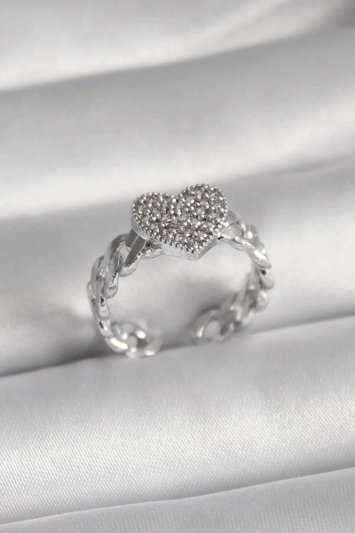 Pirinç Gümüş Renk Zirkon Taşlı Kalp Model Kadın Yüzük