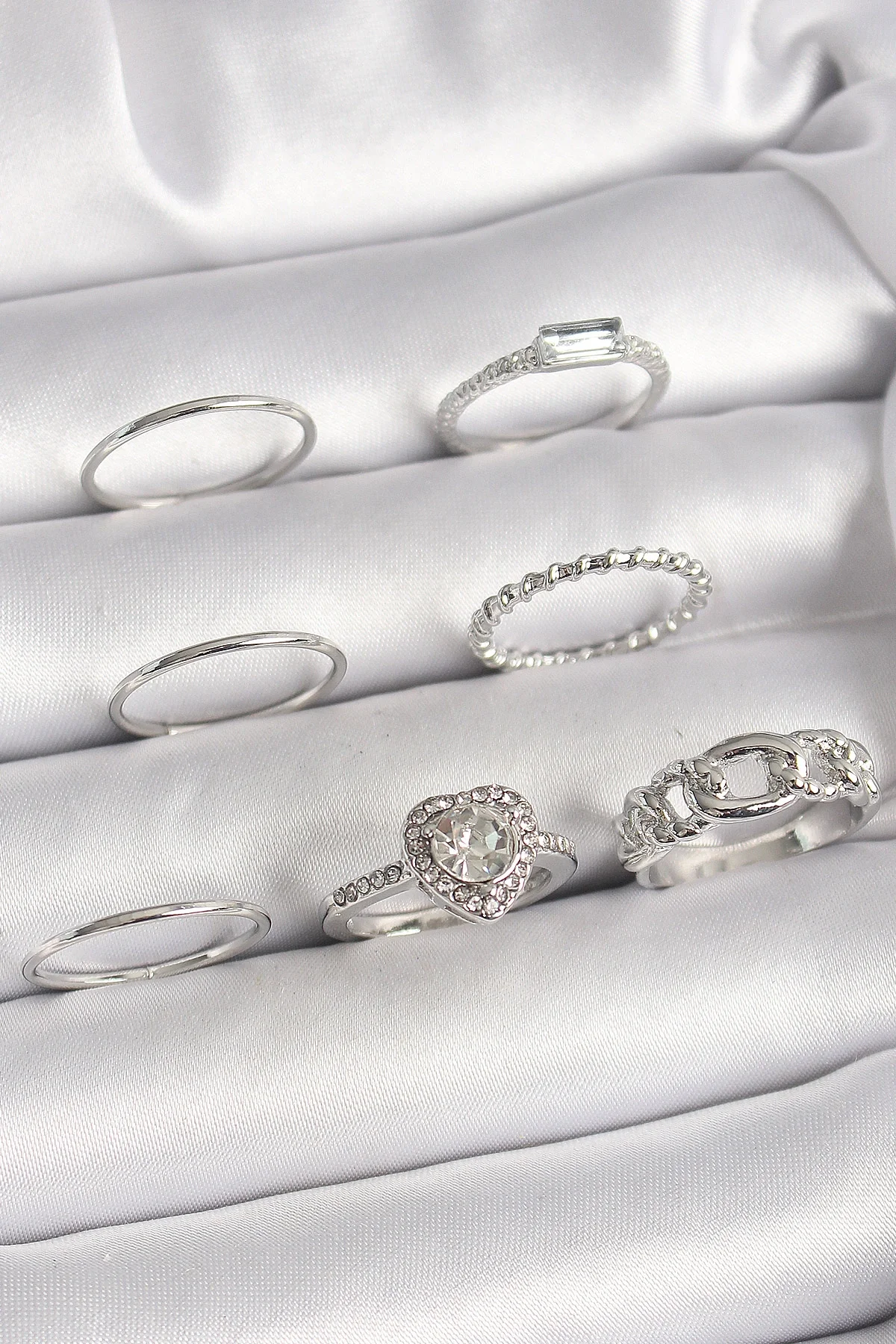 Pirinç Gümüş Renk Zirkon Taşlı Kalp Model Kadın Yüzük Kombini